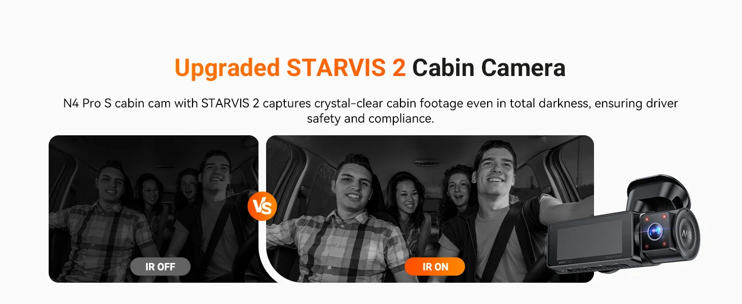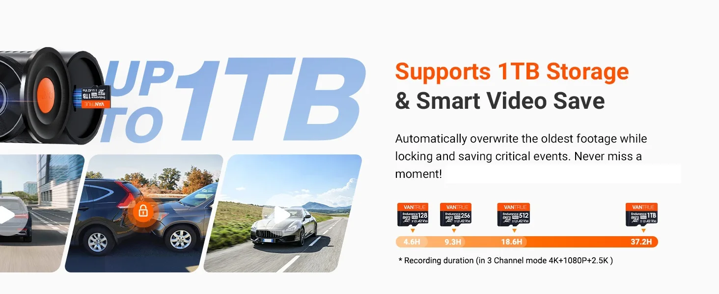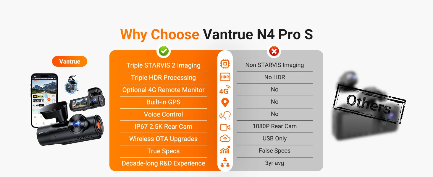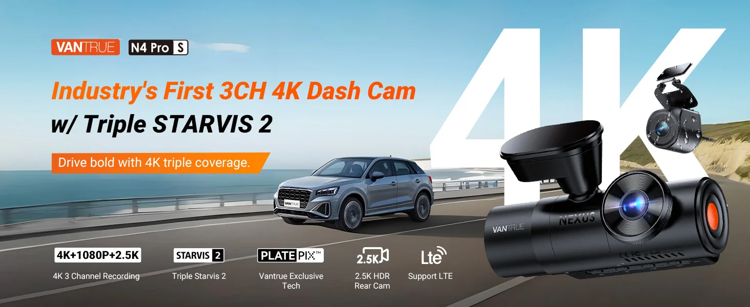[La primera cámara de tablero 3 canales 4K de la industria con triple STARVIS 2] La primera cámara de tablero de 3 canales de la industria cuenta con las 3 cámaras con tecnología STARVIS 2, que capturan momentos críticos y paisajes desde el amanecer hasta la luz de las estrellas.Protección segura, guarda recuerdos.La cámara frontal Vantrue N4 Pro S graba 4K en todos los modos (1CH/2CH/3CH).Ideal para conductores profesionales, familias y usuarios centrados en la seguridad todos los días.