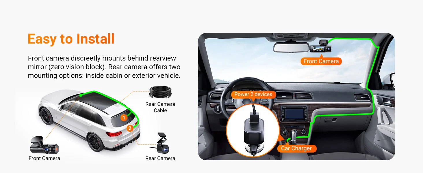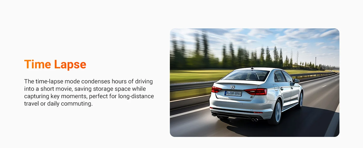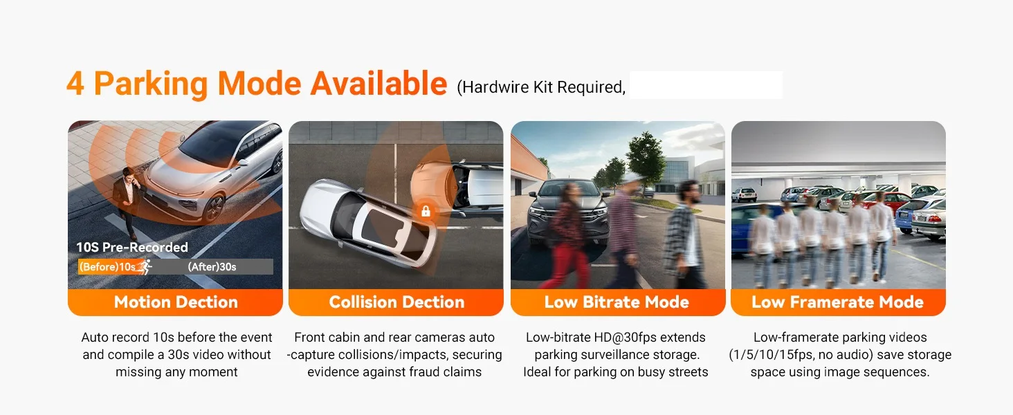 [Modo de estacionamiento las 24 horas] Con detección de movimiento amortiguada, esta cámara de tablero de 3 canales registra sin problemas todos los eventos guardando imágenes automáticamente desde 10 segundos antes de que se detecte movimiento hasta 30 segundos después de la detección, lo que garantiza una documentación completa de incidentes.Auto activa la grabación de eventos y guarda vídeo cuando se detecta un impacto.Los modos de framerato bajo y velocidad baja amplían el almacenamiento para estacionar a largo plazo.Se requiere un kit de cableado para habilitar el modo de estacionamiento completo las 24 horas.