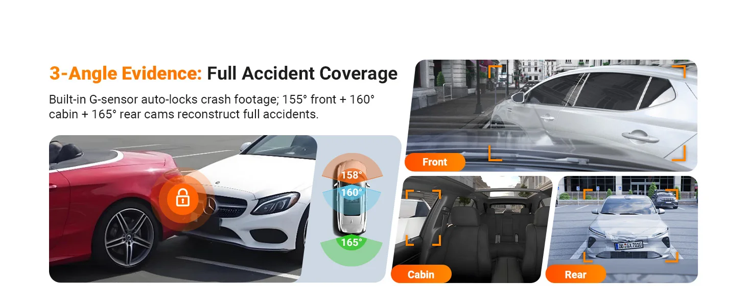 [Testigo confiable de accidentes y soporte para tarjeta SD de 1 TB] El sensor G ajustable detecta instantáneamente colisiones para bloquear imágenes críticas contra la sobrescritura de la grabación en bucle.Esta cámara de tablero de 3 canales implementa 155 ultraanchas°frente, 160°cabina, y 165°Cámaras traseras para eliminar puntos ciegos, capturar matrículas, peligros en la carretera y detalles de la cabina para una prueba de accidentes decisiva.El apagado automático de la pantalla LCD minimiza las distracciones de conducción.