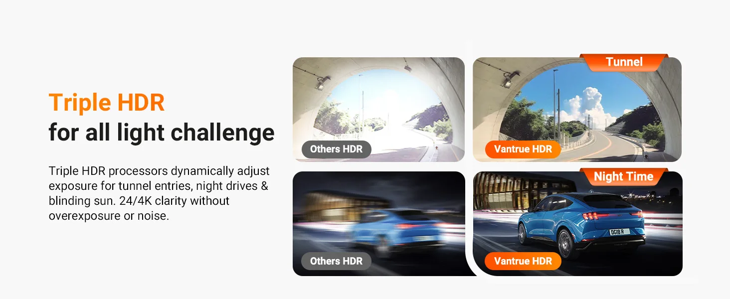 [La exclusiva tecnología PlatePix y visión nocturna de VANTRUE 4.0] La cámara frontal N4 Pro S 4K integra el reconocimiento exclusivo de matrículas PlatePix de VANTURE, el sensor de baja luz STARVIS 2 IMX678 y el HDR adaptativo que equilibra dinámicamente los faros superexpuestos y las sombras oscuras marco por marco.Este sistema de imágenes de triple capa ofrece una claridad de grado cinematográfico, logrando una precisión de reconocimiento de matrículas 2 veces mayor en comparación con las cámaras de tablero 4K de otras en condiciones de iluminación extremas.