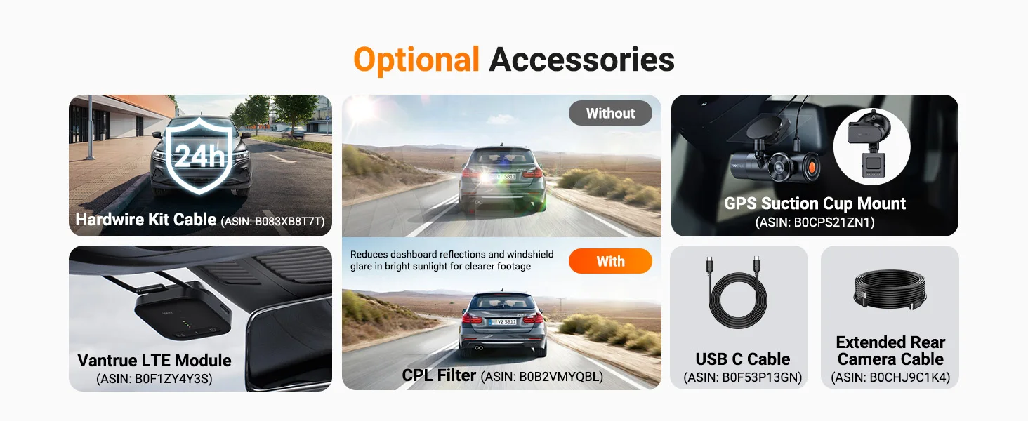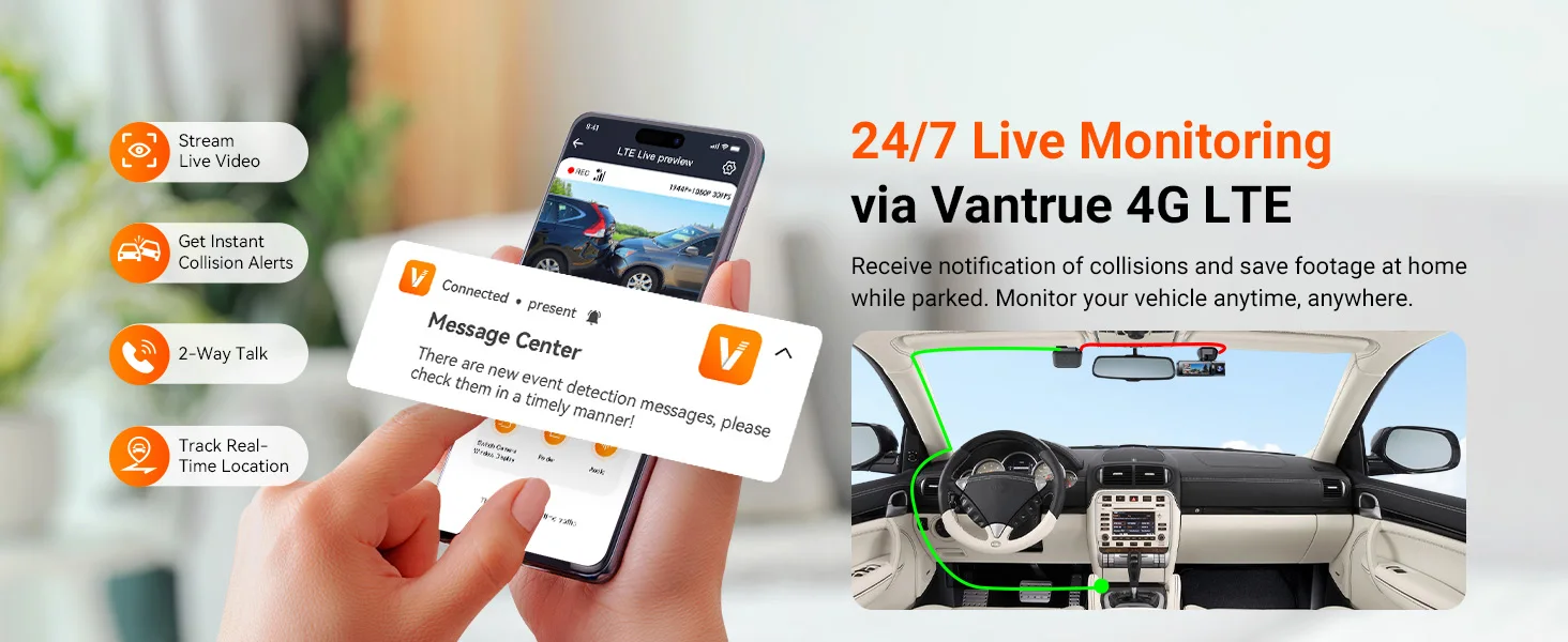 [Transmisión en vivo con módulo LTE remoto Vantrue] La cámara de tablero de 3 canales Vantrue N4 Pro S permite monitoreo remoto de vehículos las 24 horas, los 7 días de la semana con LTE opcional, diferenciándola de las cámaras de tablero normales.Puede transmitir imágenes en vivo, recibir alertas de colisión y revisar de forma remota los vehículos estacionados en cualquier momento y en cualquier lugar.Ideal para familias con conductores adolescentes, flotas de conducción y usuarios urbanos que priorizan el antirrobo.