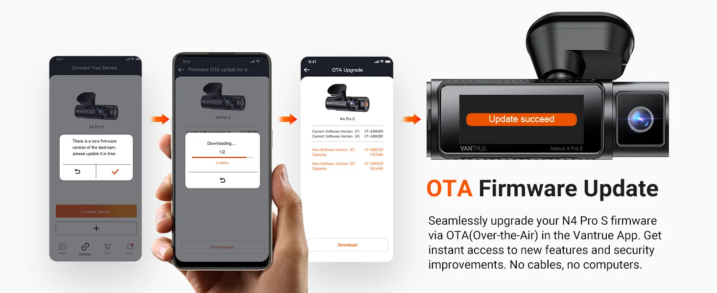 [Estadísticas de kilometraje, actualización OTA y seguimiento GPS] El GPS incorporado rastrea con precisión la velocidad/rutamiento en tiempo real del vehículo.La función de estadísticas de kilometraje de Vantrue registra la velocidad, la altitud, el tiempo/distancia recorrido, el kilometraje, etc., e incluso puede generar un informe de PDF al instante para uso del seguro.El Wi-Fi siempre activo de 5 GHz le permite acceder instantáneamente a videos marcados por GPS, compartir clips en redes sociales y actualizar su firmware N4 Pro S en 15 segundos a través de la aplicación VANTTRUE (iOS/Android).