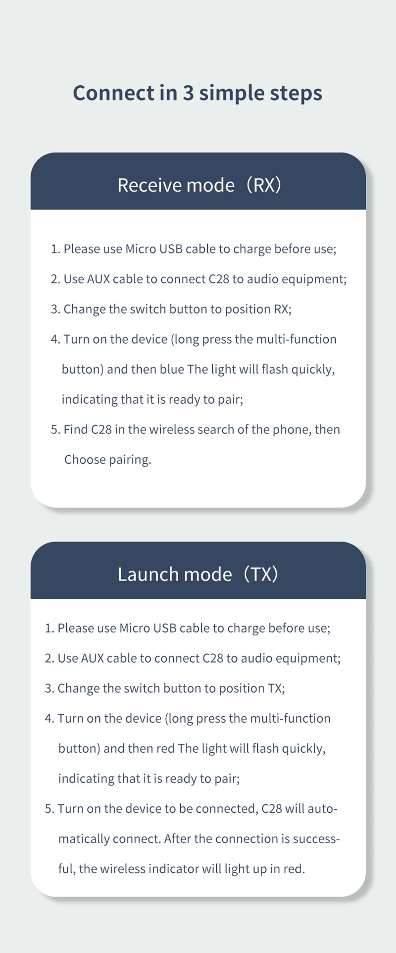 Product model: C28 2 IN 1 Bluetooth Audio Receiver Transmitter
