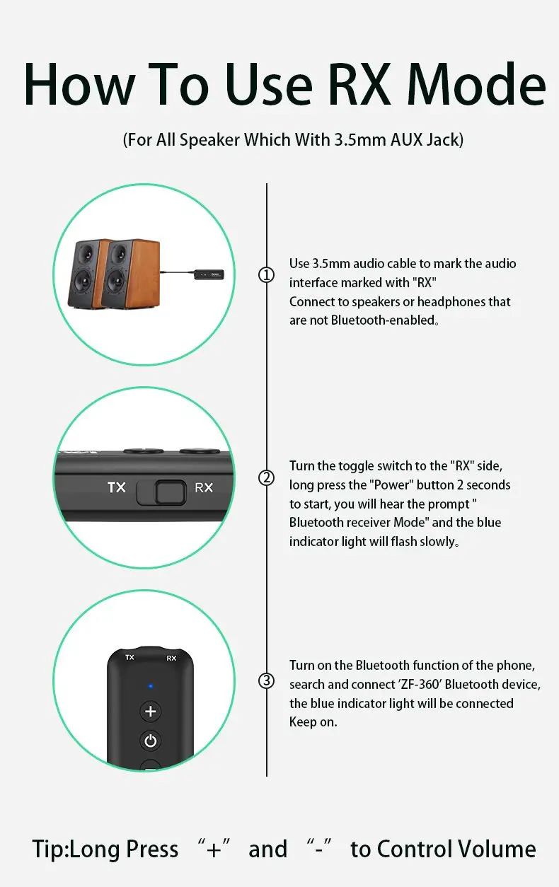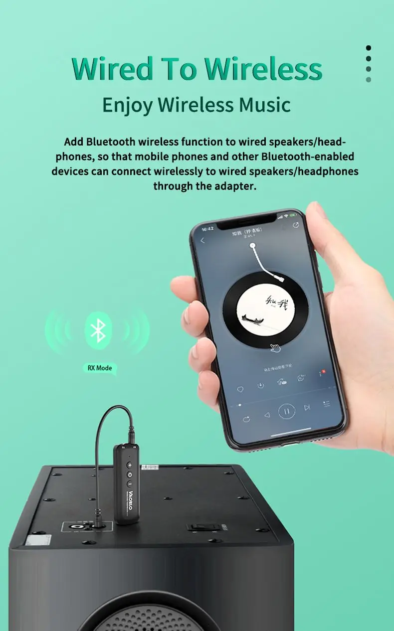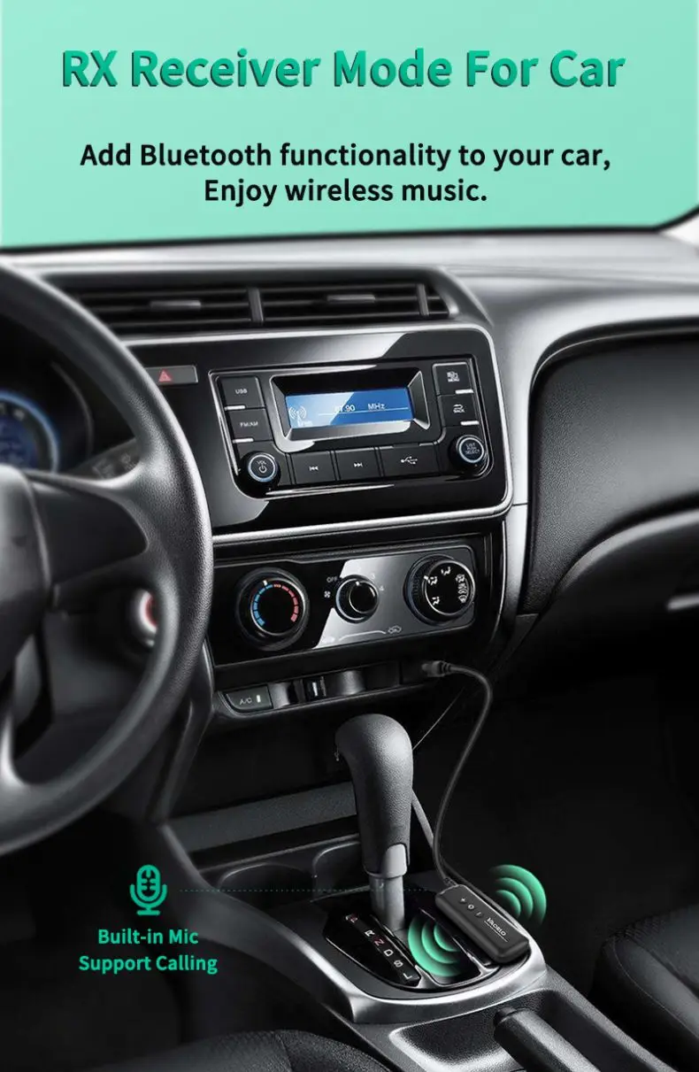• Música estéreo y llamada sin necesidad: con este adaptador, puede disfrutar de música estéreo de alta calidad y realizar llamadas con manos libres sin necesidad de alambres ni cables.(Solo el modo RX del receptor admite llamadas con micrófono)