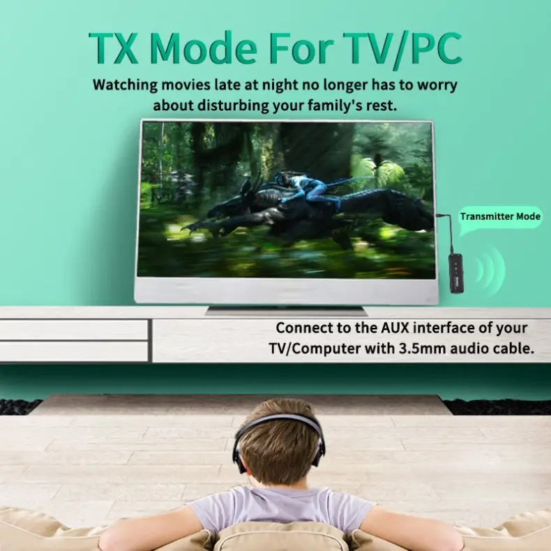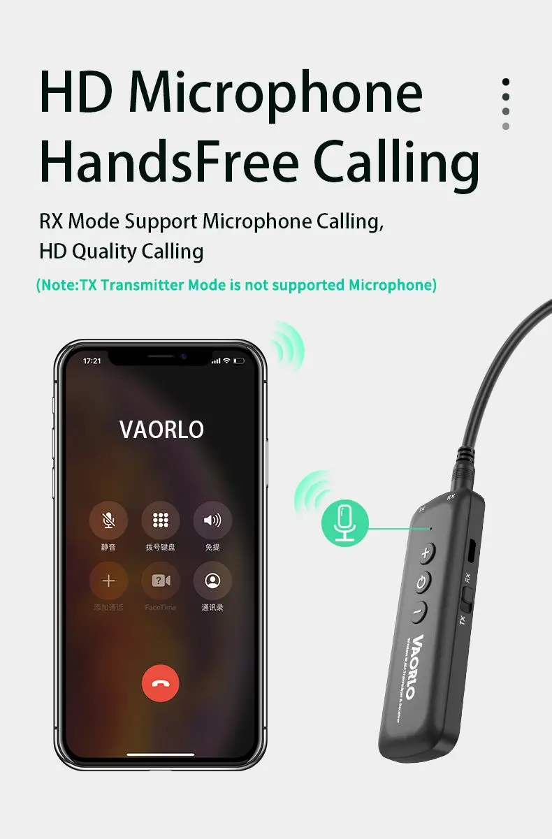 • Micrófono incorporado: micrófono incorporado de alta definición, admite escucha de música inalámbrica, llamadas con manos libres y navegación.(Nota: solo el modo RX del receptor admite llamadas de micrófono, el modo de transmisor TX no es compatible con el micrófono)