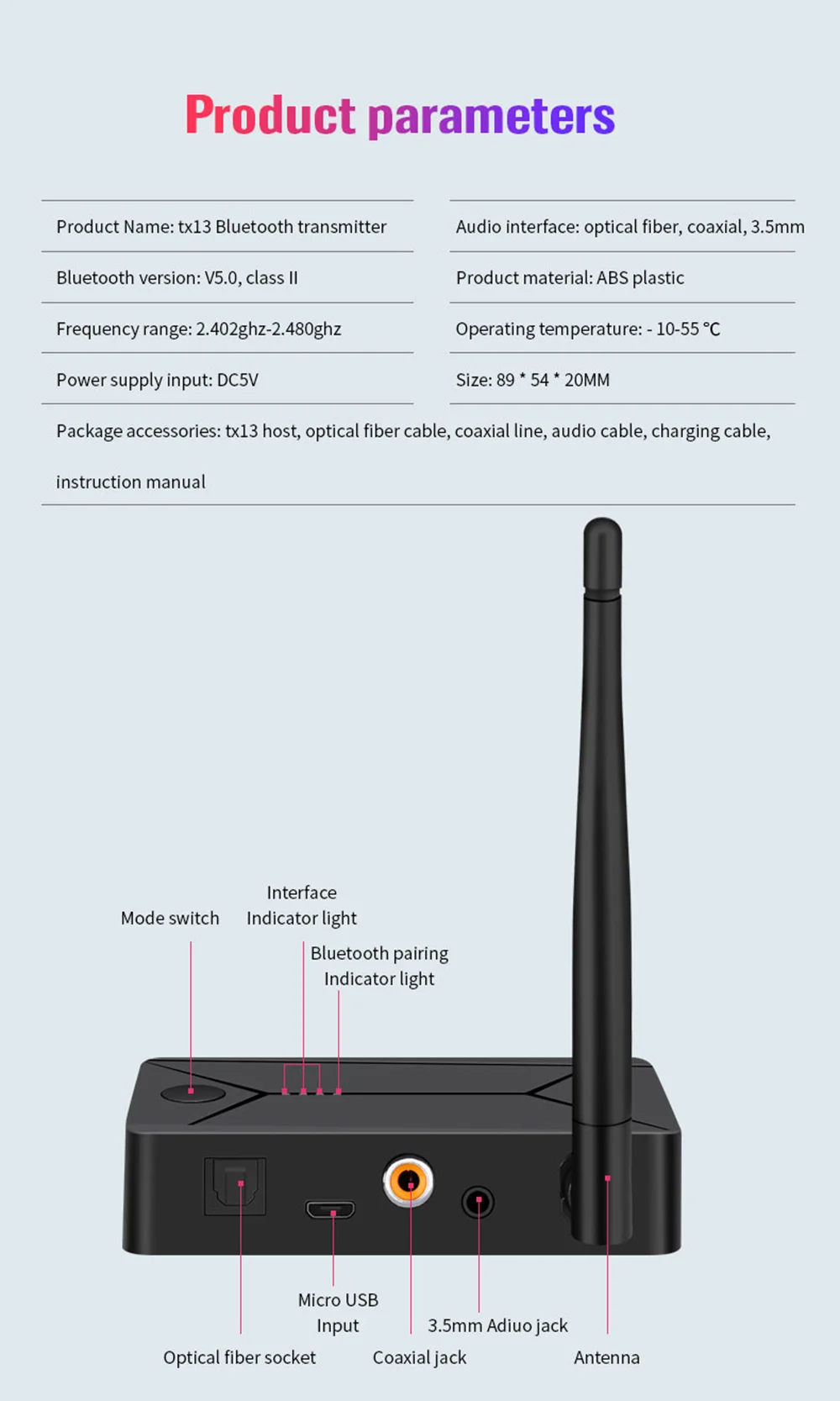 1: TX13 es un adaptador Bluetooth de doble propósito con fibra óptica. Coaxial. Transmisión Bluetooth de 3,5mm y de digital a analógico. Utiliza una fuente de alimentación USB5V. Cuando está encendido, entra en el estado de búsqueda y emparejamiento, y la luz roja parpadea rápidamente. Puede transferir música desde teléfonos móviles, walkman, TV, ordenador y otros dispositivos a su receptor Bluetooth, auriculares Bluetooth estéreo, altavoces Bluetooth y otros dispositivos de forma inalámbrica.
