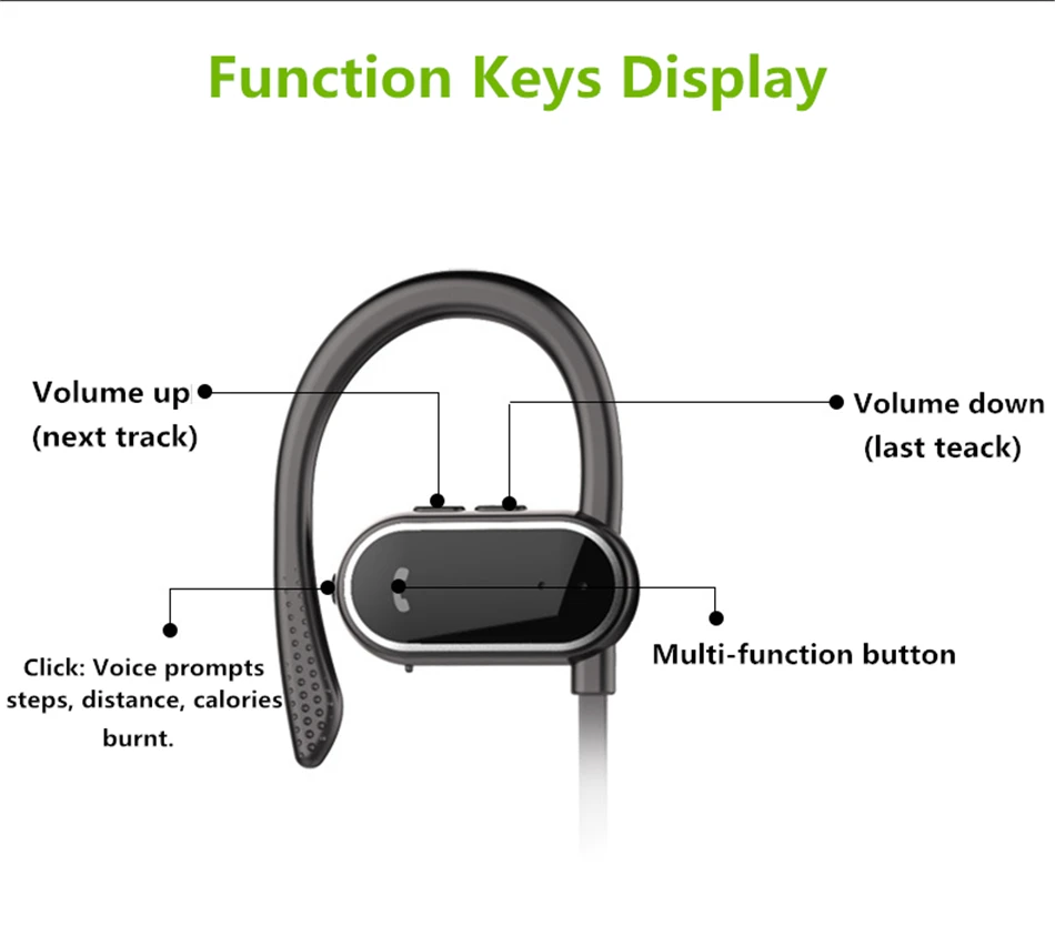 VAORLO-Auriculares deportivos con Bluetooth Ipx7, impermeables, para correr, con micrófono, para Xiaomi fone de ouvidoCaracterísticas:1.IPX7 resistente al agua, como la lluvia.2. Informa del número de pasos, la distancia y las calorías quemadas.3. Viene con la aplicación.4. Sonido estéreo de graves.5. Auriculares inalámbricos bluetooth para deporte.6. Duración de la llamada: alrededor de 15 horas7. Duración del juego: aproximadamente 12 horas8. Tiempo en espera: Aproximadamente 320 horasPaquete:1 x un auricular deportivo inalámbrico Bluetooth1 x un Manual1 x una línea de carga1 x paquete al por menor