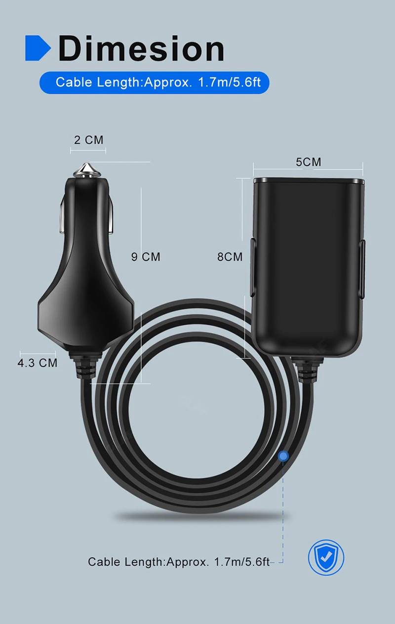 7. Come with 1.7m / 5.6ft long cord, convenient for people sit on the back seat to charge and use their phone at the same time when driving