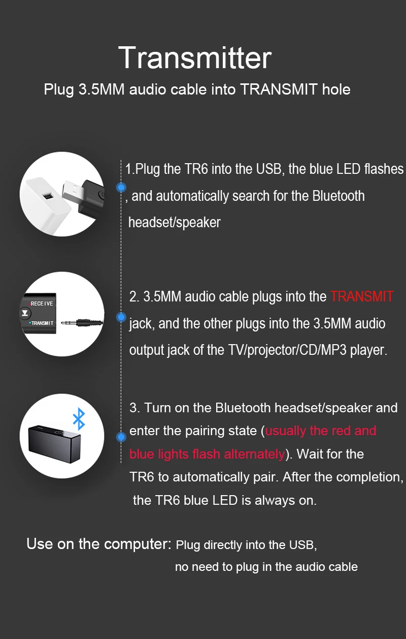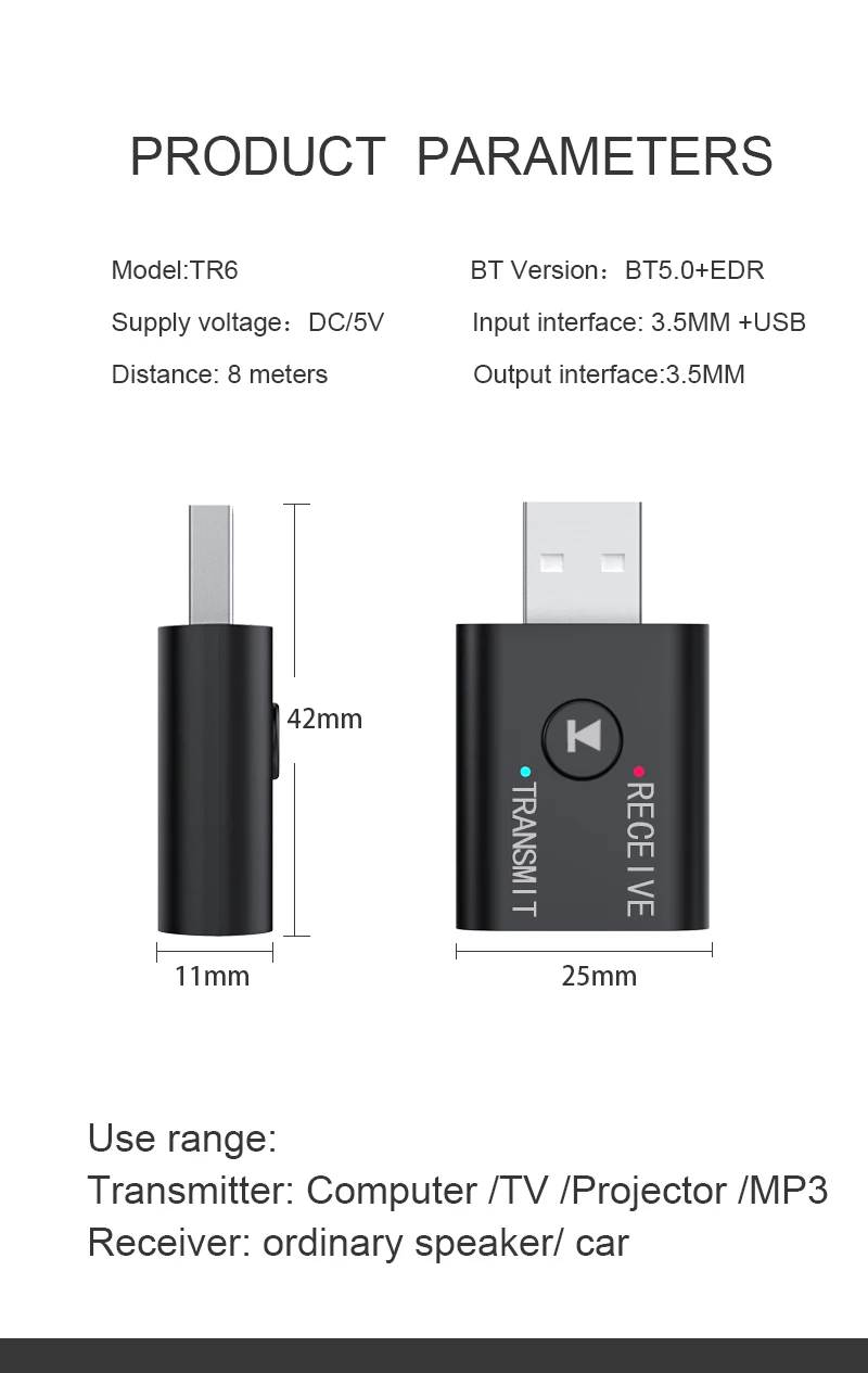 1. el modo transmisor En, convierte un televisor sin Bluetooth, PC, reproductor de CD, para iPod, MP3 / MP4 en transmisor Bluetooth. Modo receptor: ideal para el sistema de transmisión de música en casa o en el vehículo.