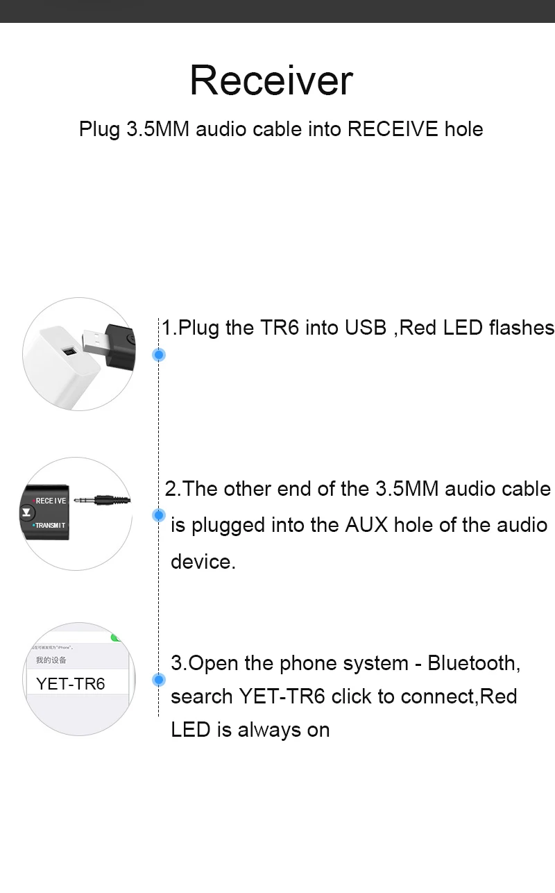 5. Operación simple, conector de audio macho a macho de 3,5mm o cable de audio macho a macho de 3,5mm para conectar los altavoces y el receptor.
