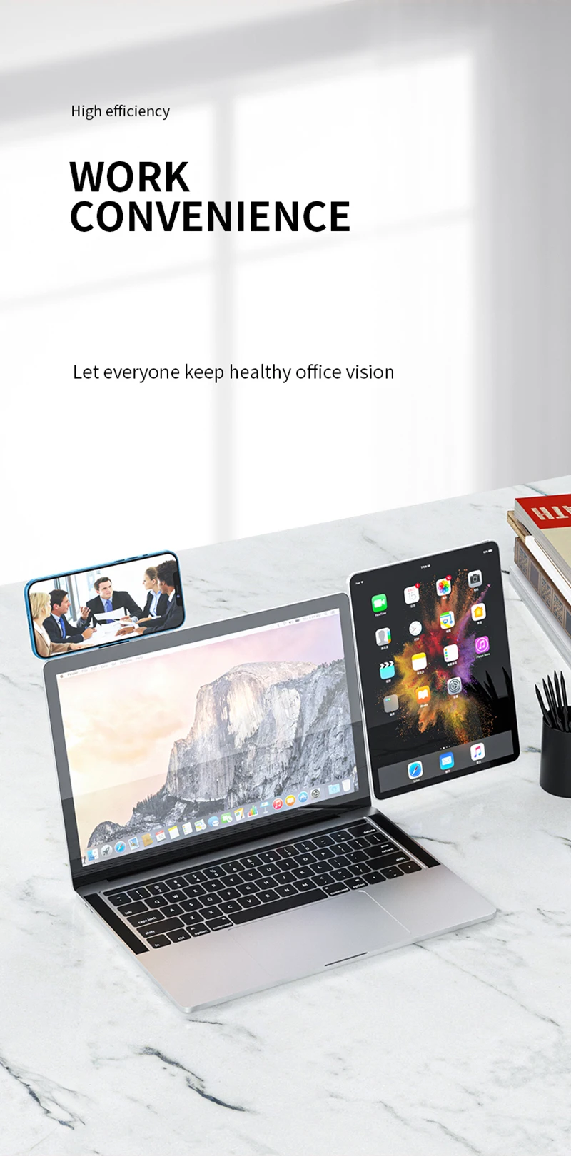 Cuando se usa, la pantalla del teléfono y la pantalla del ordenador son planas, no es necesario mirar hacia abajo en la pantalla del teléfono para ver el mensaje, mejora la eficiencia del trabajo. Fácil de instalar y usar, perfecto para la oficina en casa.
