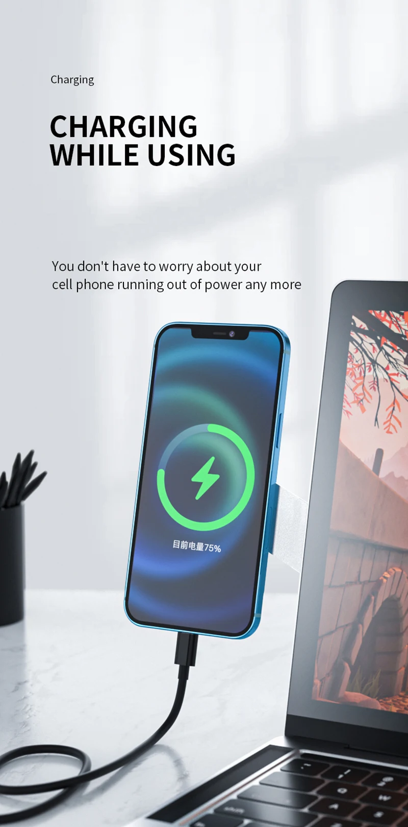 2. Cuando está en uso, la pantalla del teléfono móvil y la pantalla del ordenador están en el mismo plano, por lo que no es necesario mirar hacia abajo en la pantalla del teléfono móvil para ver los mensajes, lo que mejora la eficiencia del trabajo.