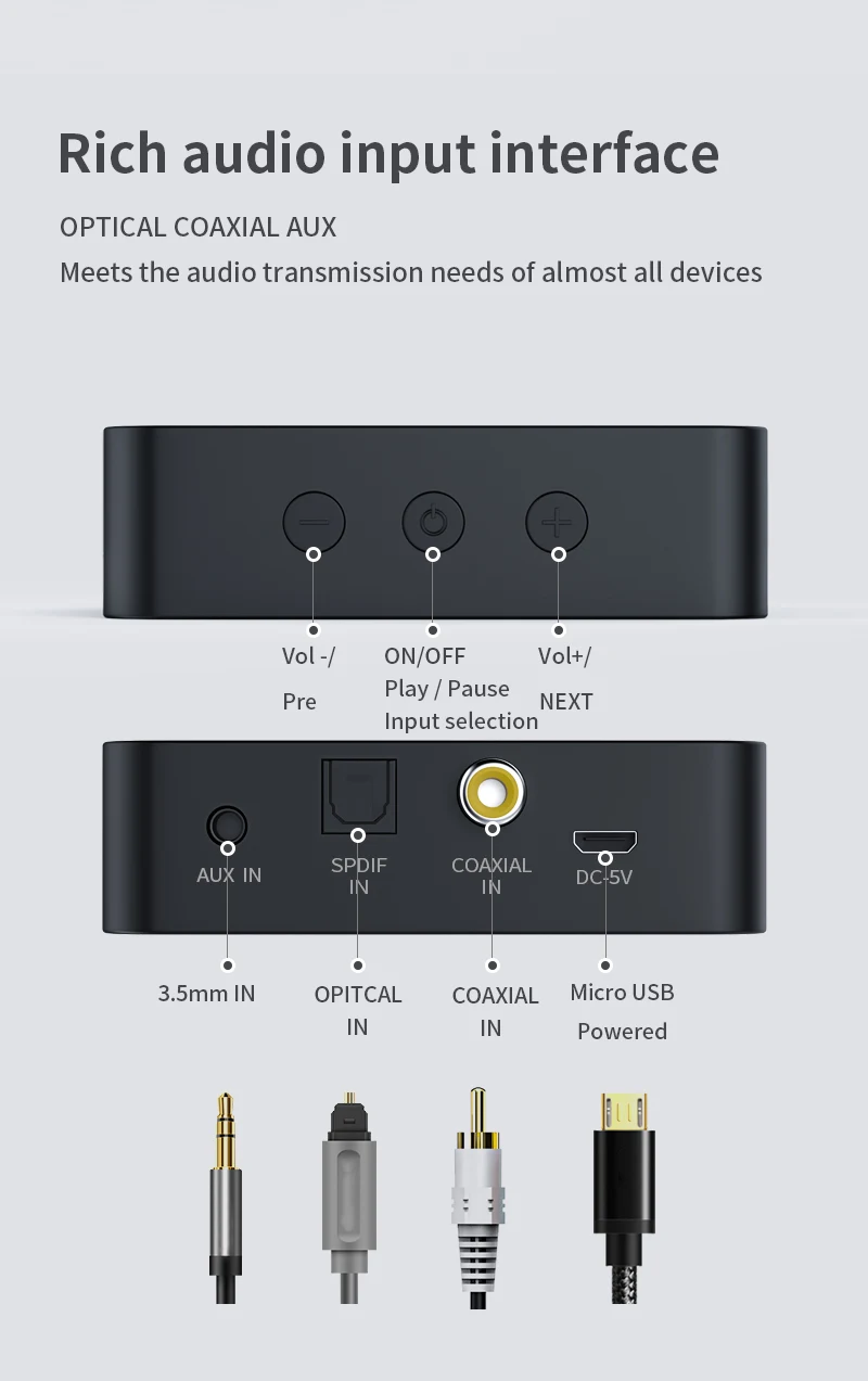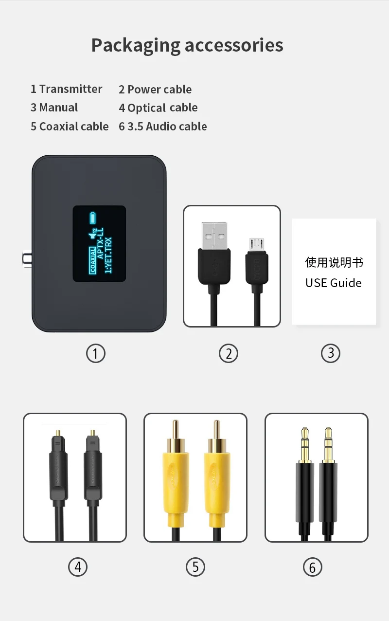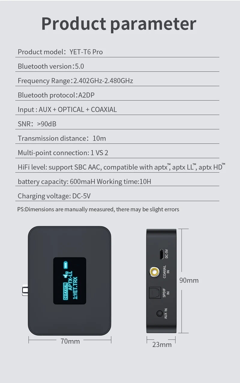 1. Pantalla OLED 2. Chip Bluetooth CSR8670: compatible con los modelos 2/1/1/APTX/ACC/SBC/A2DP/AVRCP. 3. Toslink óptico digital SPDIF + coaxial + conector auxiliar de 3,5mm tres conexiones 4. Música estéreo con sonido HIFI HD de baja latencia sin pérdidas 5. Emparejar con dos dispositivos, modos TX o RX Especificación: Versión de Bluetooth: CSR8670 V5.0 Rango de frecuencia: 2.402GHz-2.480GHz Protocolo Bluetooth: A2DP Entrada: Coaxial + Óptico + 3,5 MM SNR: 90% Distancia de transmisión: hasta 10m Admite conexión de dos puntos Calidad HiFi: compatible con SBC AAC compatible con aptX, aptx LL,aptx HD Capacidad de la batería: 600maH Voltaje de carga: Paquete: 1 Adaptador Bluetooth VAORLO OLED T6PRO CSR 1 * Cable de fibra óptica 1 * Cable coaxial 1 cable de audio de 3,5mm 1 * Cable de carga 1 * Manual de uso 1 * Paquete Retial