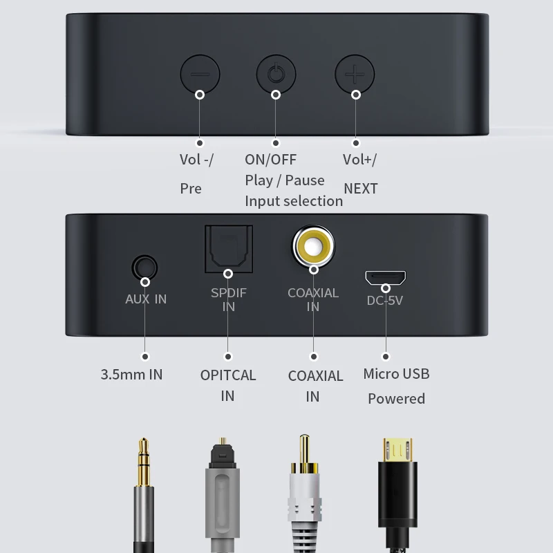 1. Pantalla OLED 2. Chip Bluetooth CSR8670: compatible con los modelos 2/1/1/APTX/ACC/SBC/A2DP/AVRCP. 3. Toslink óptico digital SPDIF + coaxial + conector auxiliar de 3,5mm tres conexiones 4. Música estéreo con sonido HIFI HD de baja latencia sin pérdidas 5. Emparejar con dos dispositivos, modos TX o RX Especificación: Versión de Bluetooth: CSR8670 V5.0 Rango de frecuencia: 2.402GHz-2.480GHz Protocolo Bluetooth: A2DP Entrada: Coaxial + Óptico + 3,5 MM SNR: 90% Distancia de transmisión: hasta 10m Admite conexión de dos puntos Calidad HiFi: compatible con SBC AAC compatible con aptX, aptx LL,aptx HD Capacidad de la batería: 600maH Voltaje de carga: Paquete: 1 Adaptador Bluetooth VAORLO OLED T6PRO CSR 1 * Cable de fibra óptica 1 * Cable coaxial 1 cable de audio de 3,5mm 1 * Cable de carga 1 * Manual de uso 1 * Paquete Retial