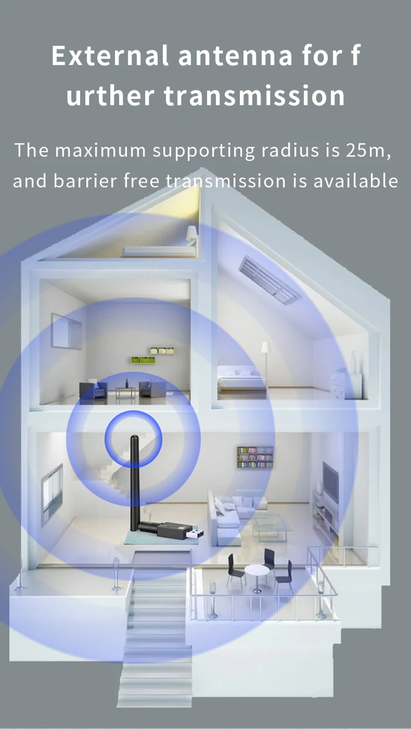 ----- Con la antena, la transmisión es más lejana y más estable, y el radio máximo de soporte es de 25 metros sin obstáculos;