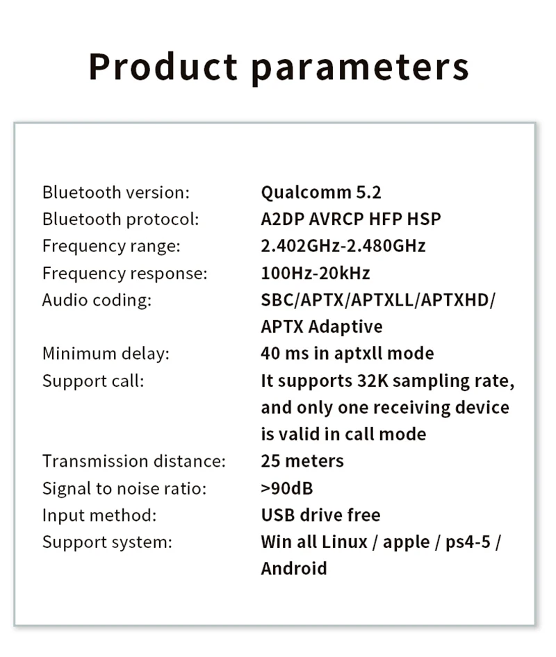 (Chip QCC3056, con antena, entrada USB, admite conexión multipunto (uno para dos), puede conectar 2 auriculares Bluetooth o altavoces Bluetooth al mismo tiempo).