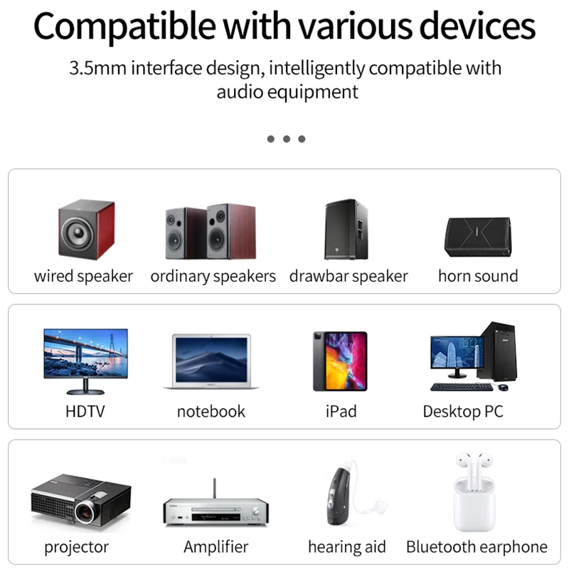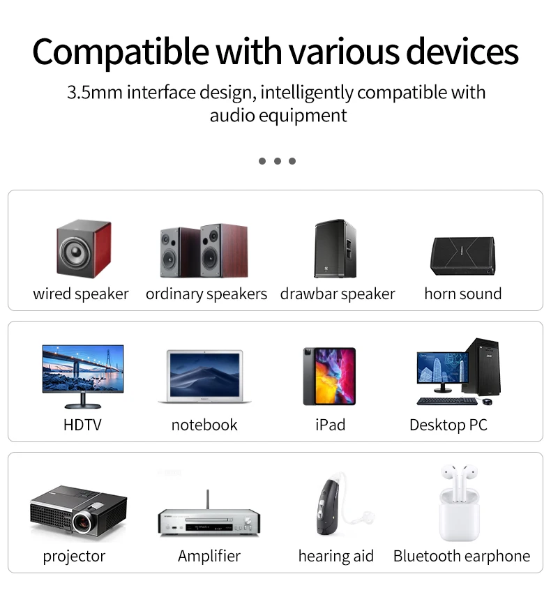 Dispositivos compatibles: Android Sistema IOS teléfonos móviles y almohadillas activo altavoces amplificadores de potencia y Bluetooth altavoces o auriculares apoyo A2DP/Protocolo están conectados para uso