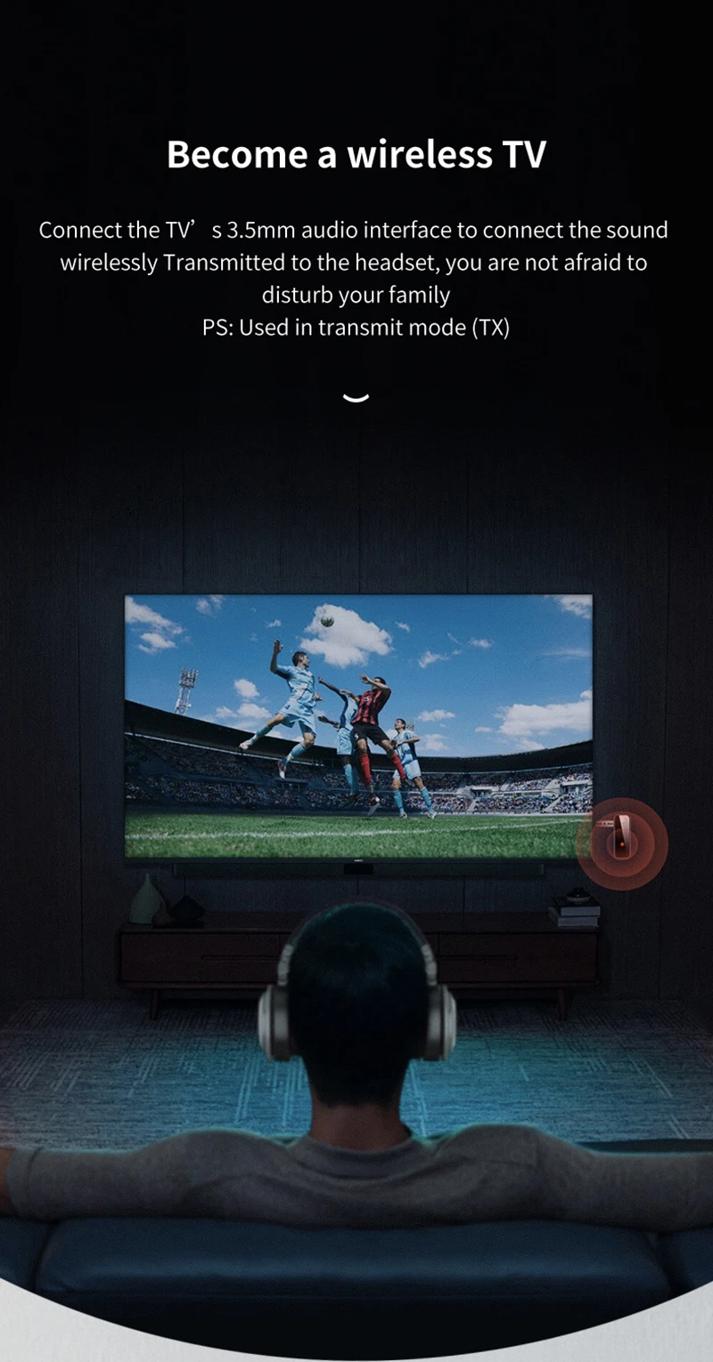 Conéctese a la interfaz de audio de 3,5mm del televisor y transmita el sonido a los auriculares a través de Bluetooth, para que no tenga miedo de molestar a su familia cuando vea películas por la noche