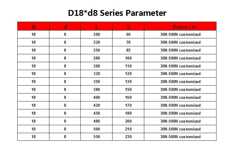 Varilla de 18*8, bisagra plegable con resorte de Gas, carrera 50-500N, soporte de elevación de fuerza, distancia central del orificio, distancia de carrera de 500-550mm, 200-230mm