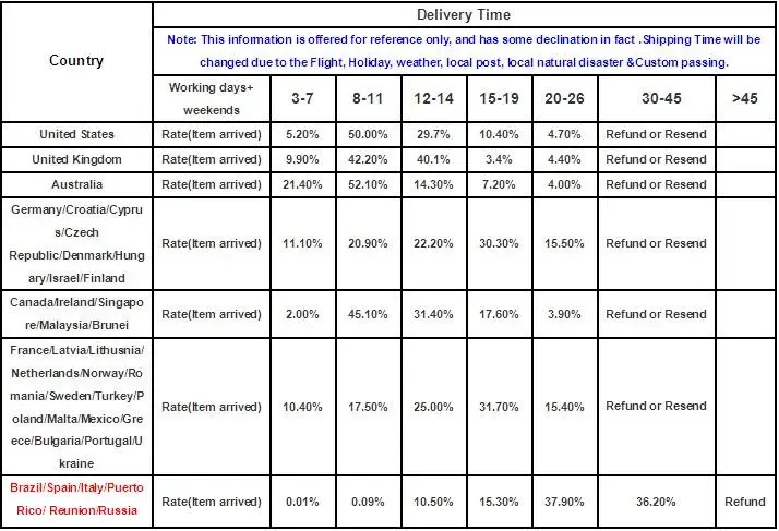 Los artículos se envían dentro de los 5 días hábiles una vez que se realiza el pago completo. Si no puede recibir sus artículos a tiempo, comuníquese con nosotros primero, lo verificaremos y lo resolveremos pronto. Responderemos su correo normalmente dentro de las 24 horas.A veces hay un pequeño retraso debido al fin de semana o feriado. Si no puede recibir nuestro correo después de 48 horas, verifique su correo no deseado o contáctenos con otra dirección de correo.