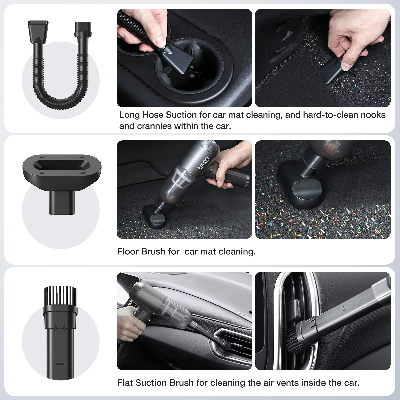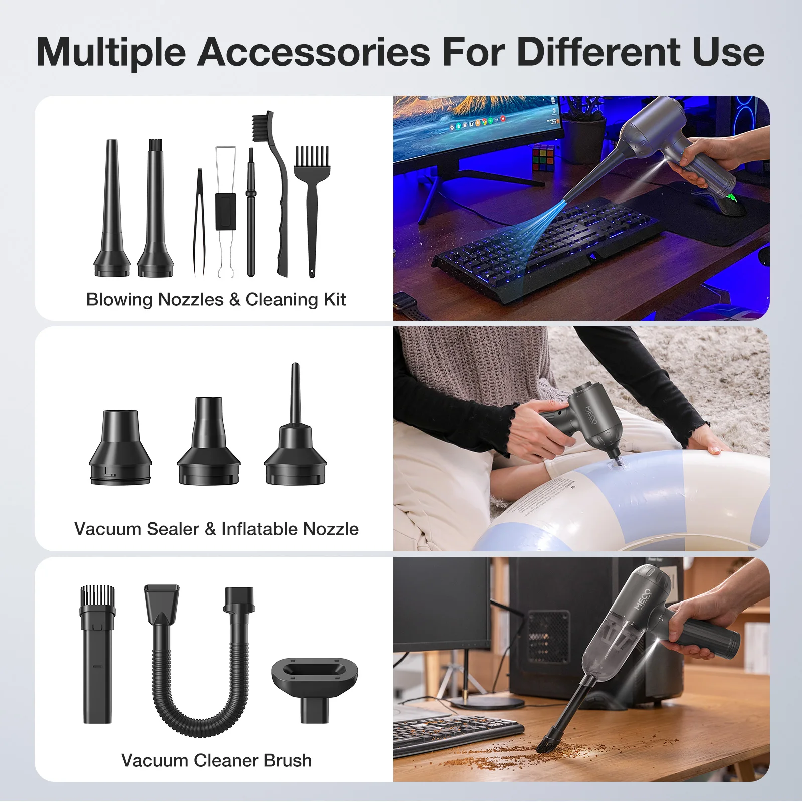 El soplador de polvo MECO está fabricado con una variedad de boquillas y un cepillo para una mayor limpieza, adaptándose a diversas necesidades.El plumero de aire permite una fácil limpieza en zonas de difícil acceso.Las luces LED incorporadas se iluminan automáticamente a medida que se enciende el dispositivo, iluminando rincones oscuros y agregando una capa adicional de comodidad a su rutina de limpieza.