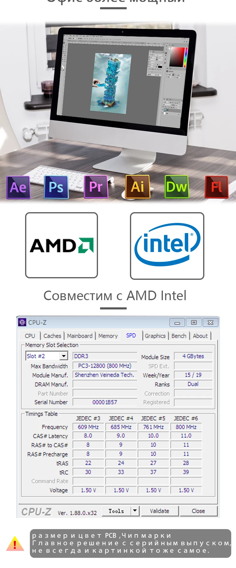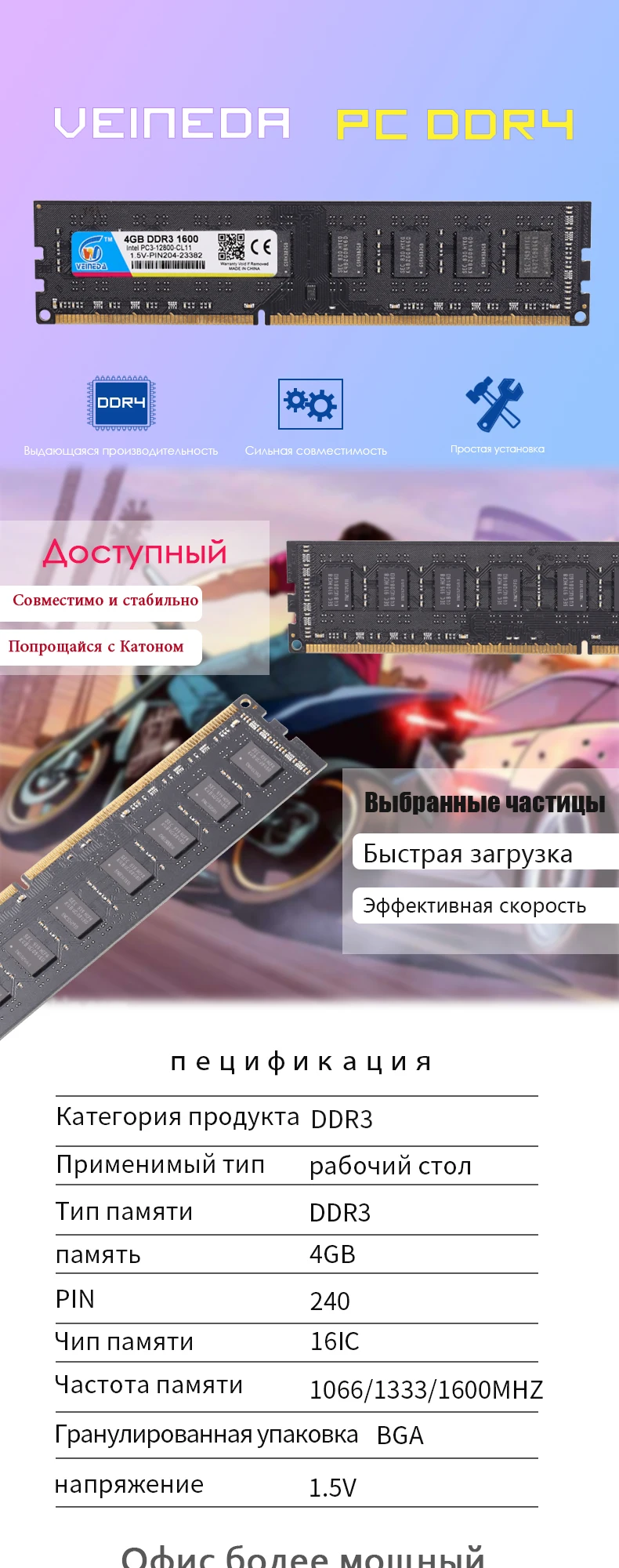 Memoria ram VEINEDA DDR3 4gb 1066Mhz ddr 3 4gb Memoria de PC3-8500 240pin compatible 1333 1600 para AMD Intel Desktop