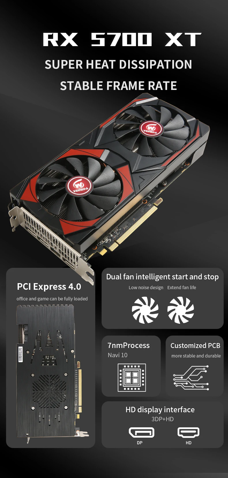 Tarjeta gráfica rx 5700xt 8gb GPU GDDR6 256bit 8pin 7nm tarjeta de vídeo compatible con escritorio rx 5700 xt CPU placa de vídeo