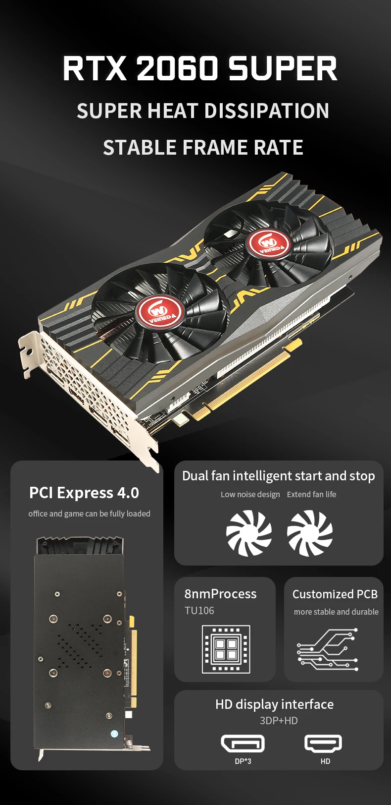 Comprar VEINEDA-tarjeta gráfica RTX 2060 super 8G, GPU GDDR6, 256Bit, 7000mhz, para ordenador de sobremesa, PCI E 3,0