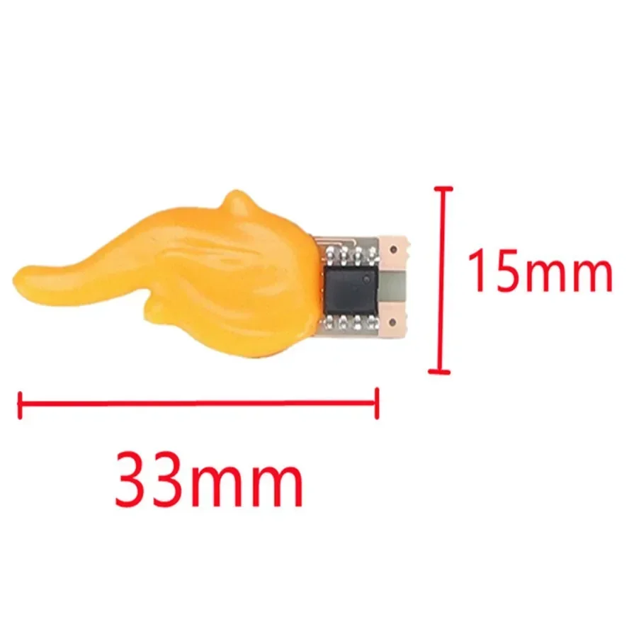 El producto recibido difiere mínimamente de la foto en la oferta. Esta "llama" es una imagen compuesta por aproximadamente 30 micro LEDs controlados por un chip, que crea una imagen en movimiento. Funciona a 2.5 V, consumiendo alrededor de 1 mA con puntos visibles de pequeños LEDs. A 3 V, brilla intensamente con una buena "movilidad" de la llama brillante, consumiendo entre 18 y 30 mA. El efecto es muy bueno. No me atreví a probar fuentes de alimentación de mayor potencia.