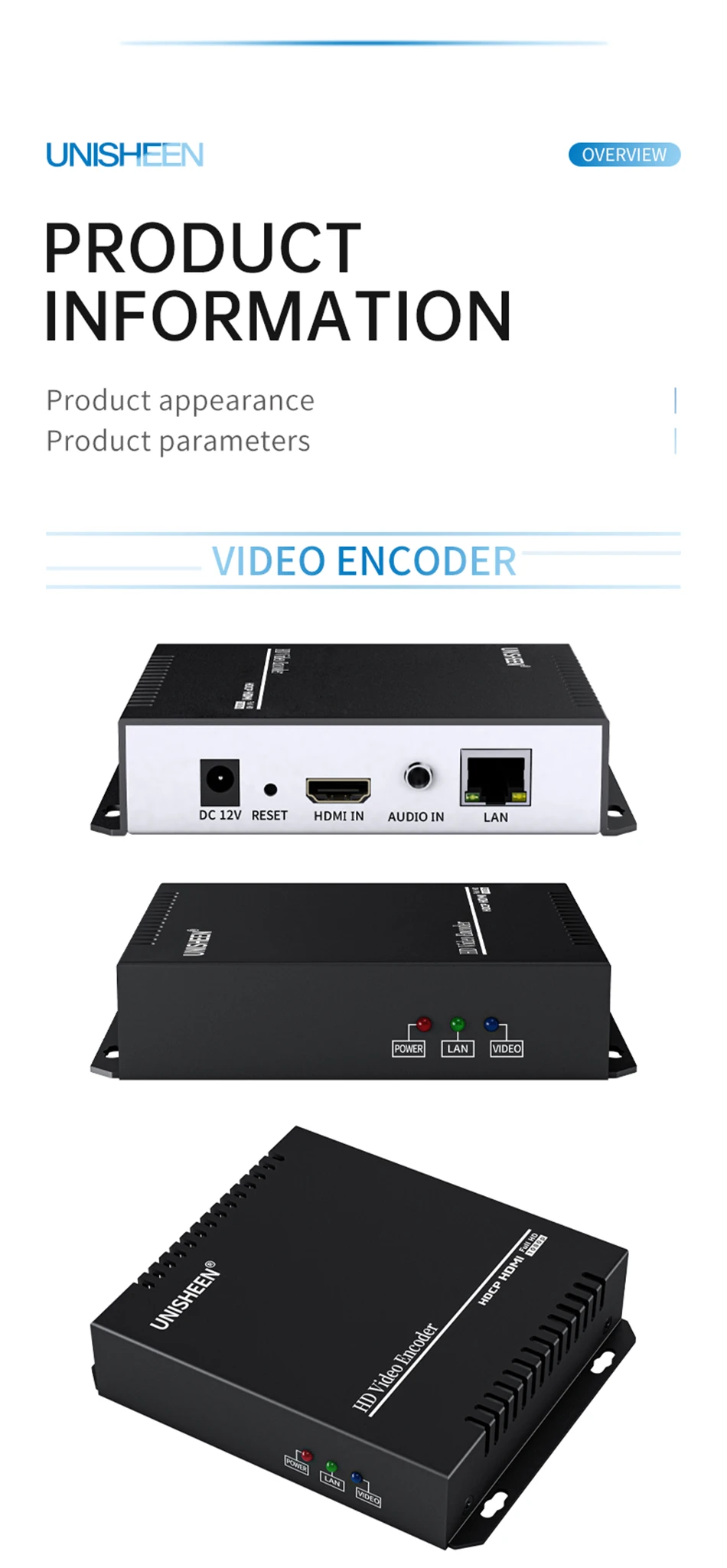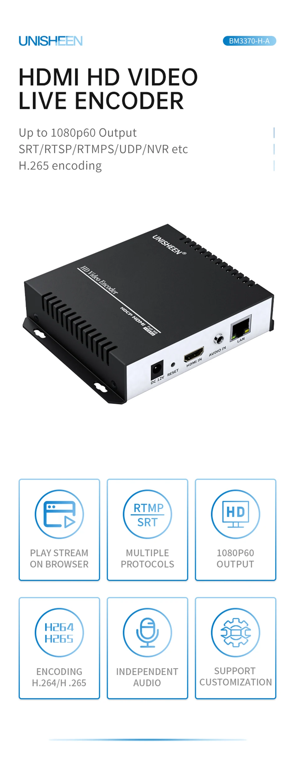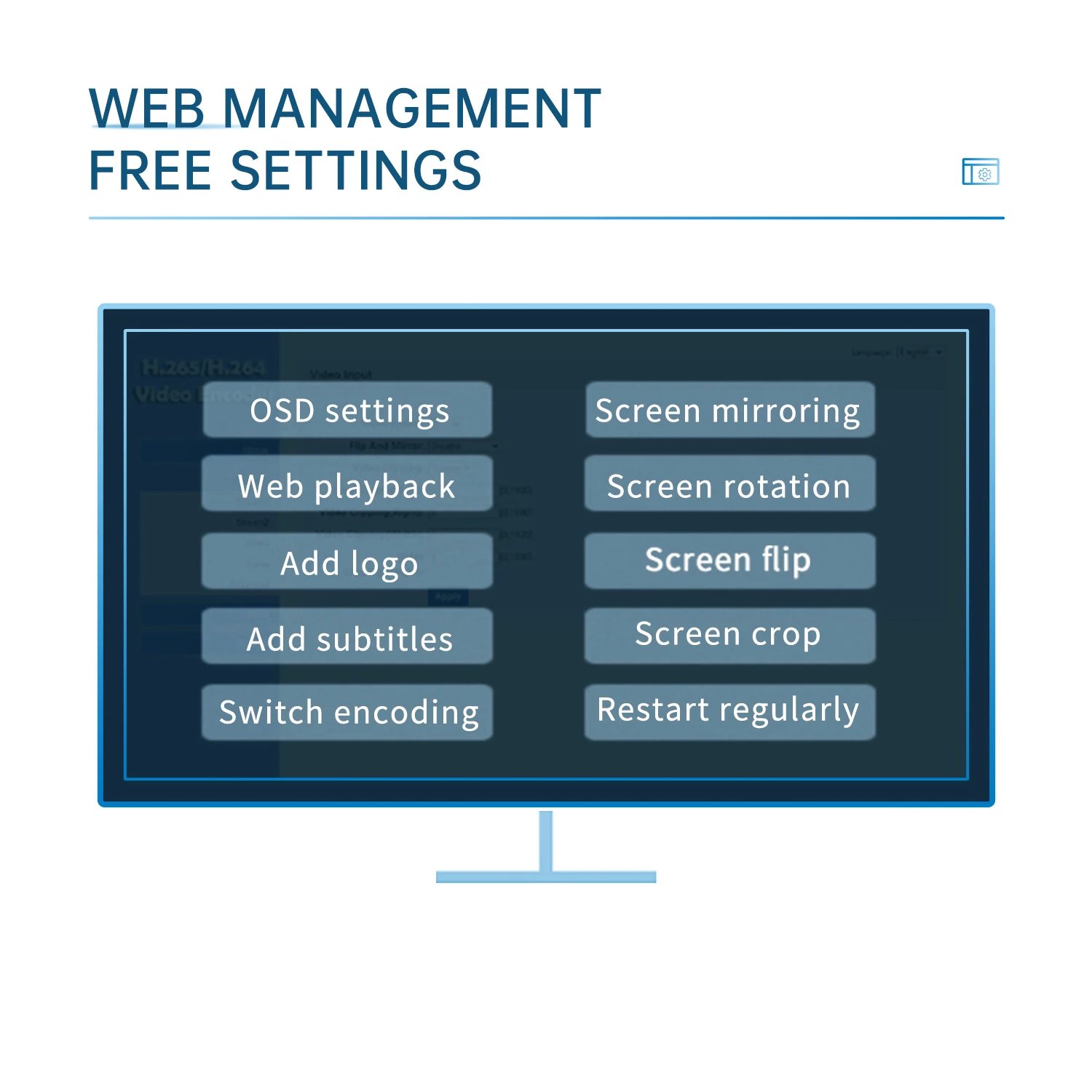 * EDID conmutable * Hasta 1080p60 Salida * SRT/RTSP/RTMPS/UDP/NVR, etc. * Protocolo privado de baja latencia UTP * Video giratorio, voltado, espejo, clip * Transmisión de audio o video separada * Reproducir transmisión en el navegador * Personalizable