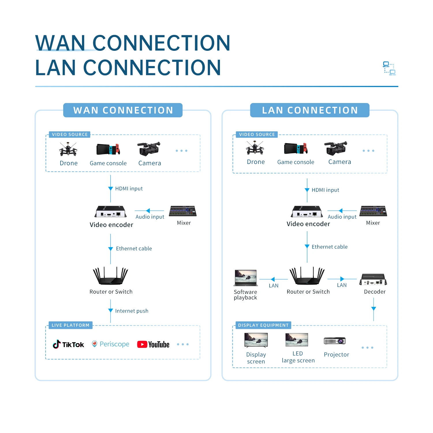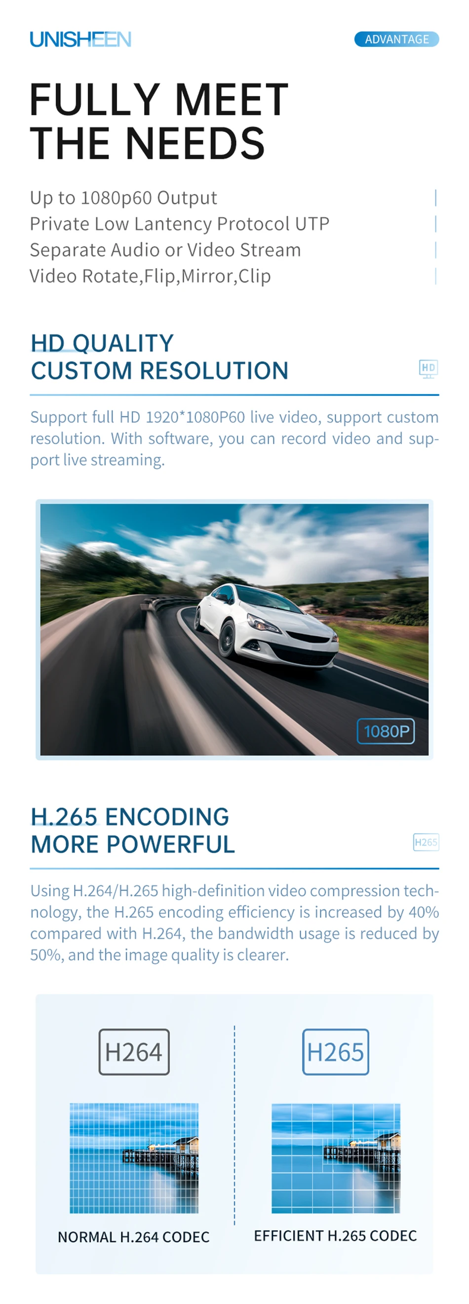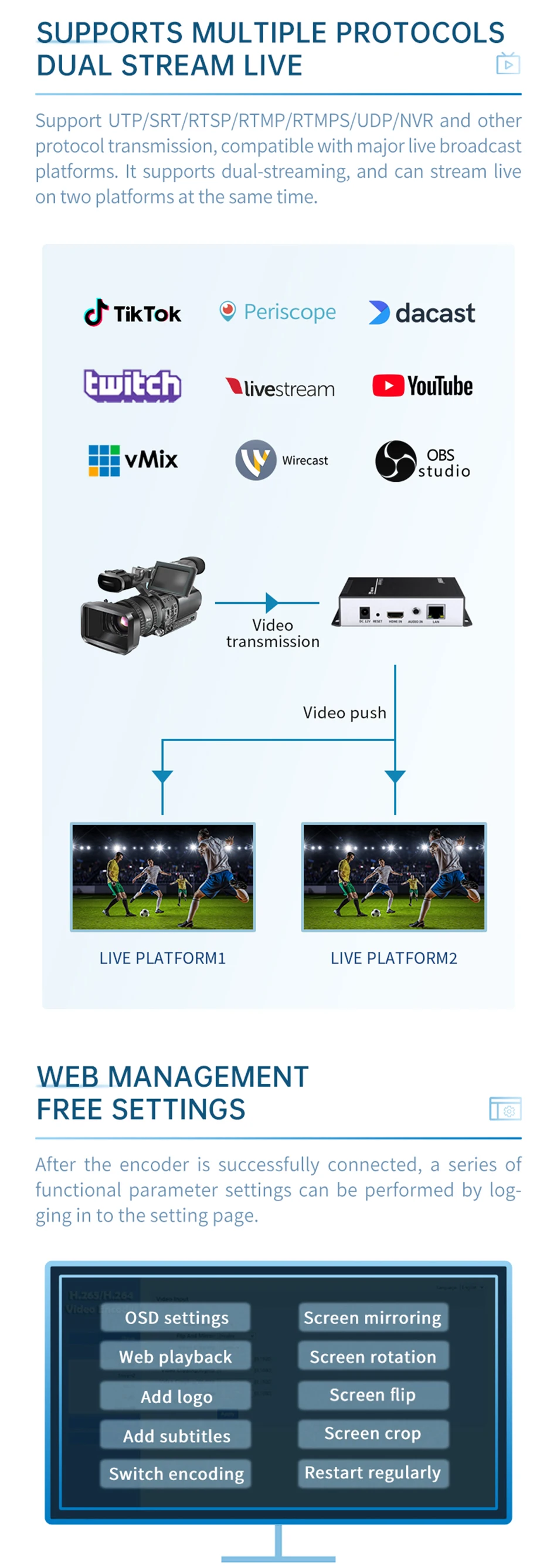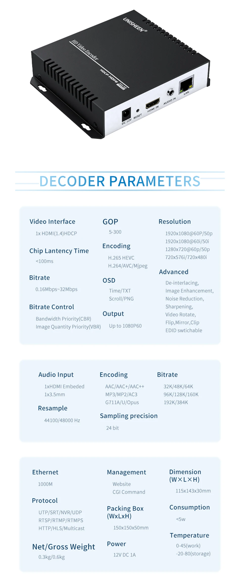 * EDID conmutable * Hasta 1080p60 Salida * SRT/RTSP/RTMPS/UDP/NVR, etc. * Protocolo privado de baja latencia UTP * Video giratorio, voltado, espejo, clip * Transmisión de audio o video separada * Reproducir transmisión en el navegador * Personalizable