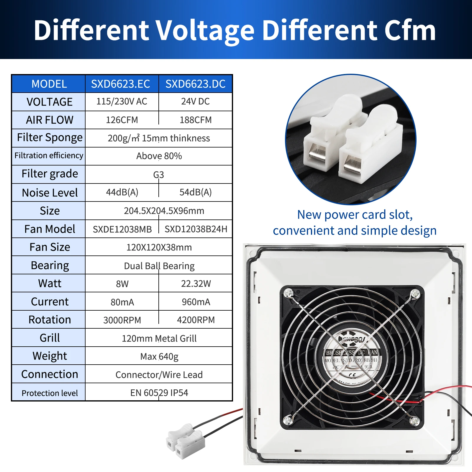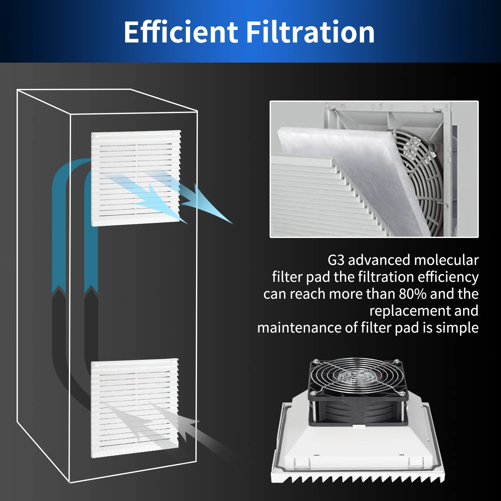 El polvo puede ser el peor enemigo de un sistema eléctrico, ya que tiene el potencial de reducir el rendimiento de refrigeración o causar daños cuando se queda demasiado acumulado.Proporcionamos filtros en la unidad, estos filtros proporcionan el máximo flujo de aire con un filtrado eficaz del polvo.Las unidades se pueden montar directamente en el ventilador o en un panel.