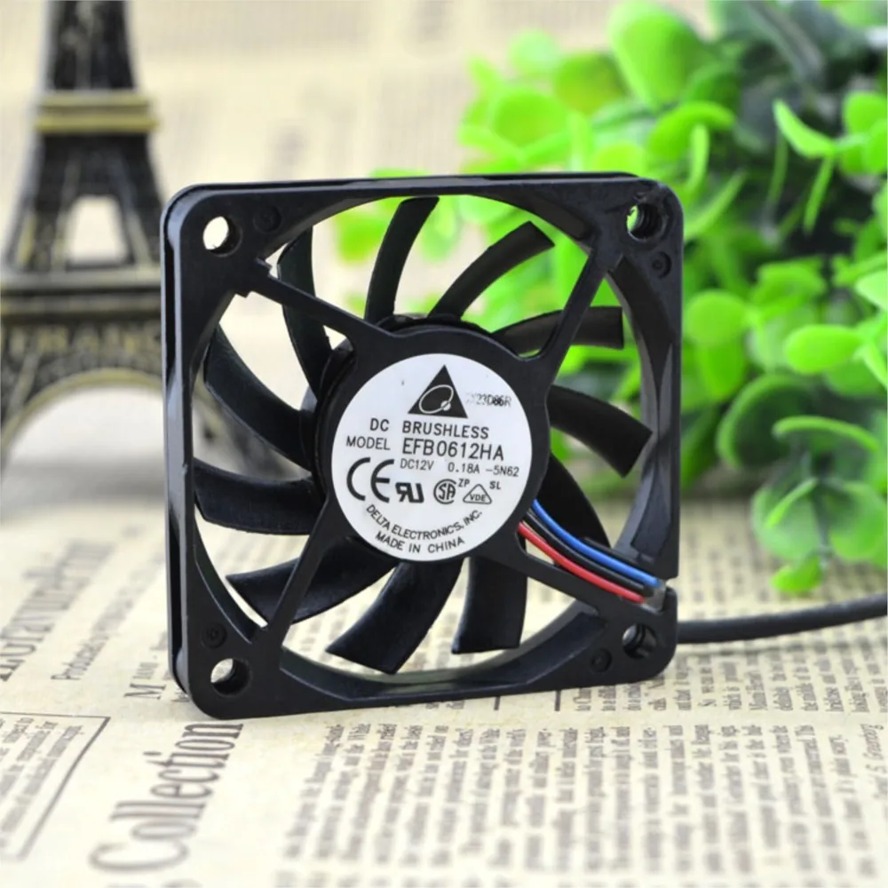 Product Description This Delta EFB0612HA 60mm cooling fan is a compact, ultra-slim solution expertly designed for effective thermal management in small electronics, PC cases, and tight enclosures. Measuring a mere 60x60x10mm and operating on DC 12V with a low 0.18A current, this fan features durable dual ball bearings. It delivers a powerful 18.1 CFM airflow at a rapid 4200 RPM with significant static pressure and a low noise profile, ensuring stable and exceptionally long-lasting cooling for your critical components in space-constrained environments. Key Selling Points Ultra-Slim & Compact Design: With its compact 60x60x10mm dimensions, this fan packs immense cooling power into a very thin profile. It's a go-to choice for space-constrained applications such as low-profile heatsinks, mini PCs, and other tight electronic enclosures, providing essential airflow where it's most needed. High-Speed Airflow (4200 RPM): Engineered for superior heat dissipation, this compact fan operates at a rapid 4200 RPM. This is crucial for effectively preventing overheating in high-heat electronics and providing aggressive electronic cooling for PC components and other small devices. Ultra-Durable Double Ball Bearings: Equipped with high-quality double ball bearings, this fan is engineered for exceptional stability, reduced friction, and an extended operational lifespan. This ensures consistent and reliable equipment cooling over many years of intensive, 24/7 use. Low Noise Operation (33 dBA): Despite its powerful performance, this fan operates at a manageable noise level of 33 dBA. This makes it an excellent choice for a variety of environments where efficient thermal management is needed without excessive disruptive sound. Energy-Efficient DC 12V Operation: Operating on DC 12V with a very low 0.12A actual current, this fan provides effective cooling while remaining remarkably energy-efficient. It's an ideal choice for continuous-duty industrial cooling solutions where power conservation is a consideration. Product Specifications Brand: For Delta Model: EFB0612HA Size: 60 x 60 x 10mm Voltage: DC 12V Current: 0.18A (0.12A actual) Power: 1.44W Rotational Speed: 4200 RPM Air Volume: 18.1 CFM Wind Pressure: 0.132 in H₂O Noise: 33 dBA Bearing: Double Ball Bearing Weight: 28g Application Areas This high-performance industrial cooling fan is indispensable for PC case cooling, motherboard heat dissipation, mini PCs, industrial PCs, and any compact application where an efficient DC 12V fan with robust airflow, a slim profile, durable construction, and reliable thermal management solutions are crucial for preventing overheating and ensuring long-term system stability and longevity.