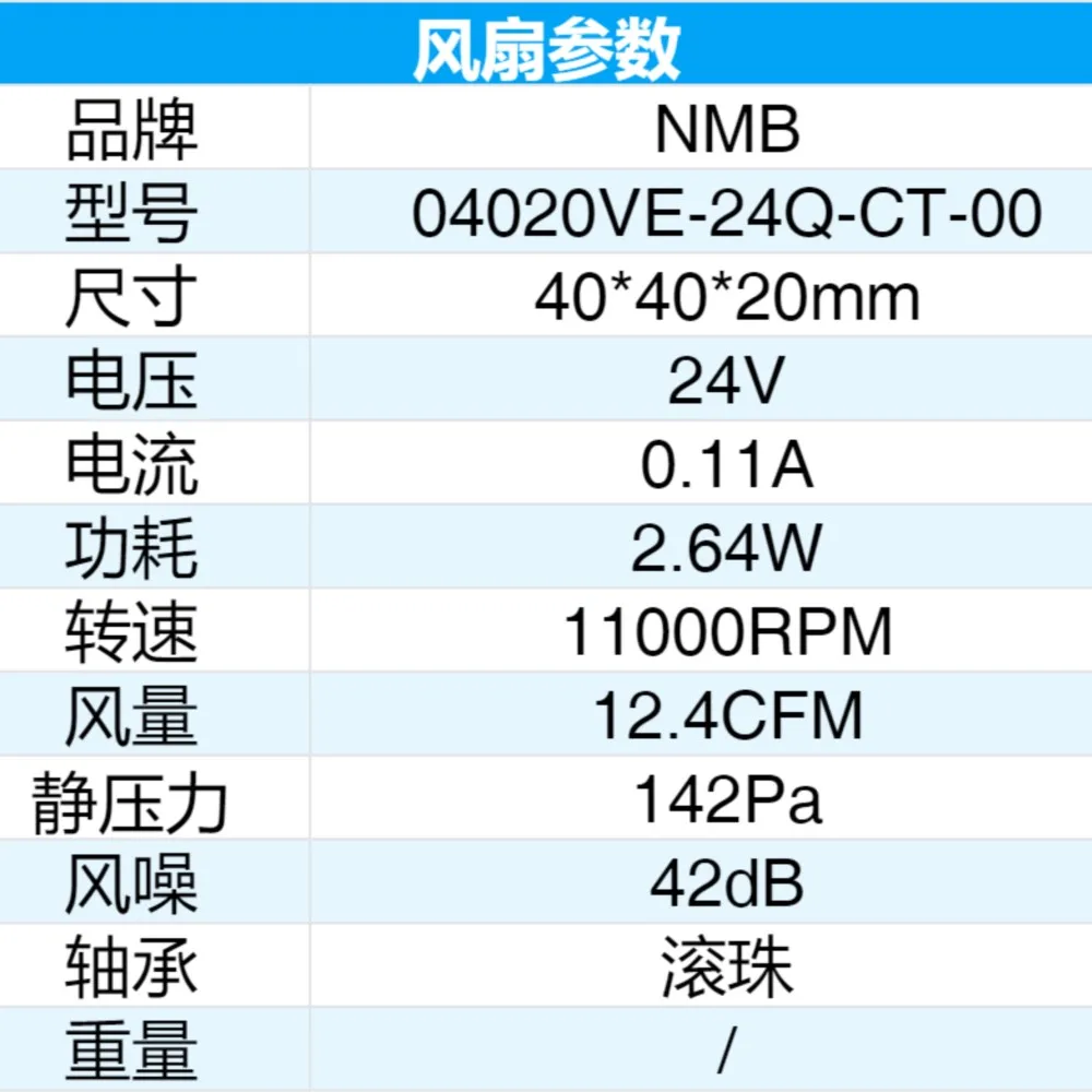 El NMB 04020VE-24Q-CT es un ventilador sin escobillas CC de 40 mm de alto rendimiento diseñado para una refrigeración eficaz en dispositivos electrónicos donde el espacio es limitado.Con unas dimensiones de 40x40x20 mm, este ventilador proporciona un fuerte flujo de aire.Funciona a 24 V con un consumo de corriente de 0,11 A (potencia de 26,56 W), logra una alta velocidad de 11000 RPM, brindando 12,4 CFM de flujo de aire.El diseño del rodamiento de bolas garantiza un rendimiento fiable y constante.Este ventilador es ideal para aplicaciones que exigen refrigeración de alta velocidad en un formato compacto.