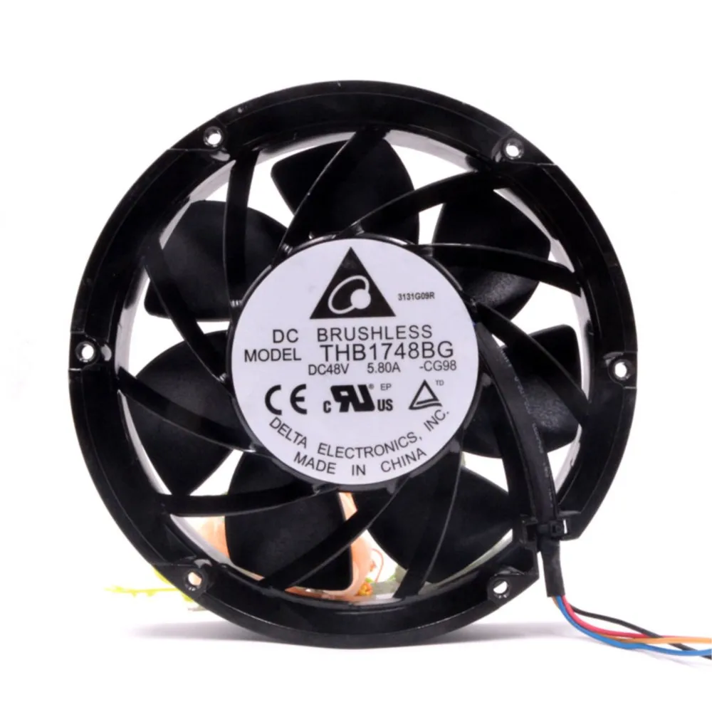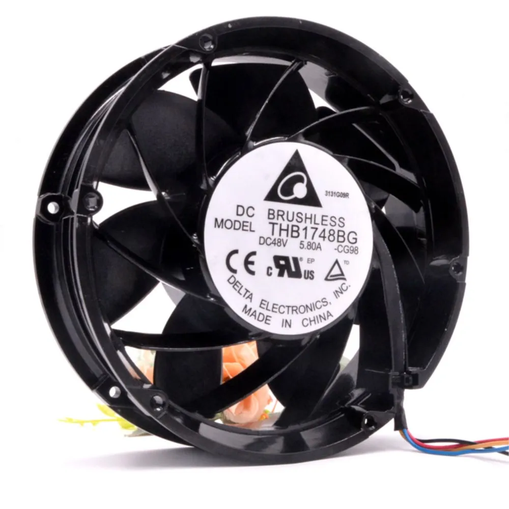 Product Description: The Delta THB1748BG is a high-performance 48V cooling fan designed for industrial, data center, and server applications. With a large 17cm diameter and 607 CFM airflow, it ensures effective cooling even in high-demand environments. The fan features a PWM speed control and speed sensor for precise airflow regulation, ideal for cooling large systems or critical equipment. Built with a durable aluminum frame and high-quality ball bearings, it supports continuous, heavy-duty use. The fan operates at 8000 RPM and is engineered to handle environments ranging from -10°C to 70°C. Key Selling Points: Powerful Airflow: 607 CFM for efficient cooling of large industrial systems and servers. Advanced Control: PWM control and speed sensor for optimal performance and airflow regulation. Durable Build: Aluminum frame and ball bearings for robust and long-lasting operation. Wide Voltage Range: Operates within 36V to 56V, offering flexibility for various setups. High-Performance: 8000 RPM speed for effective cooling in high-heat environments. Applications: Perfect for cooling data centers, industrial equipment, power supplies, and large-scale electronics where high airflow and precise cooling control are essential.