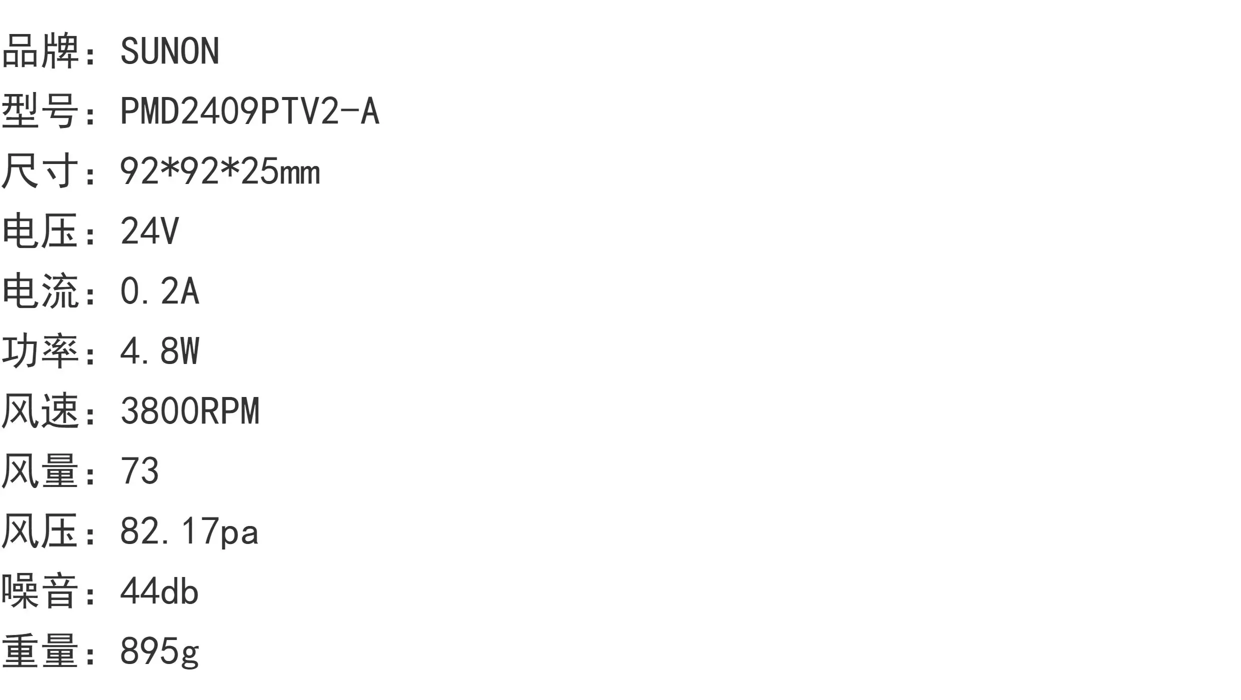 Product Description: The SUNON PMD2409PTV2-A is a high-quality, imported axial flow fan designed for reliable cooling in various industrial and electronic applications. With a standard 92x92x25mm frame size, this 24V DC fan operates at 0.2A, consuming 4.8W to deliver a consistent airflow of 73 CFM at a speed of 3800 RPM. It also provides a static pressure of 82.17 Pa, ensuring effective cooling performance. Operating at a moderate noise level of 44 dB, this fan offers a good balance of cooling power and quiet operation. Weighing 895g, this imported SUNON axial fan is built for durability and consistent performance. Key Selling Points: Imported Quality: High-quality construction for reliable and long-lasting performance. Efficient Cooling: Provides a good airflow of 73 CFM and static pressure of 82.17 Pa. Quiet Operation: Low noise level of 44 dB, suitable for noise-sensitive environments. Standard 9225 Size: Easy to integrate into existing setups (92x92x25mm). Reliable 24V DC Operation: Stable performance with a 24V power supply. Trusted SUNON Brand: A reputable manufacturer of cooling solutions. Axial Flow Design: Efficiently moves air along its axis. Application Scenarios: This imported industrial axial fan is suitable for a wide range of cooling applications, including: Industrial Control Cabinets: Maintaining optimal temperatures for electronic components. Power Supplies: Cooling internal components to ensure reliability. Telecommunications Equipment: Providing airflow for network devices. Testing and Measurement Equipment: Ensuring stable operating temperatures. Ventilation Systems: Assisting in air circulation within enclosures. Automated Machinery: Cooling electronic controls and motors. Lighting Systems: Dissipating heat from high-power lighting fixtures. Any application requiring reliable axial flow, industrial cooling with a balance of performance and noise. Hot Search Keywords (integrated within the text): industrial cooling fan axial flow fan 92mm fan 24V fan imported fan low noise fan electronic cooling thermal management DC fan equipment cooling