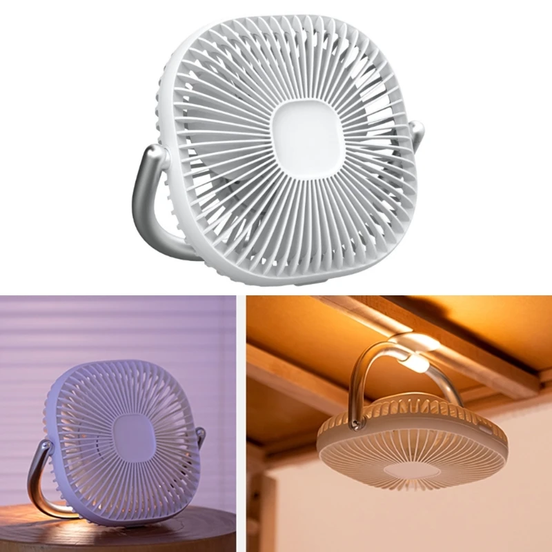 De plástico de alta calidad, esta versátil lámpara de ventilador se puede colgar en paredes o utilizar como ventilador de escritorio o de mano. También cuenta con un práctico orificio de 1/4 pulgadas para montar en trípodes.