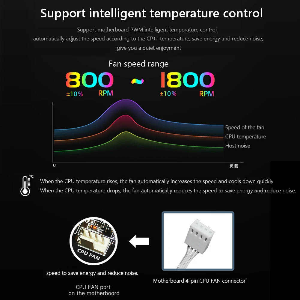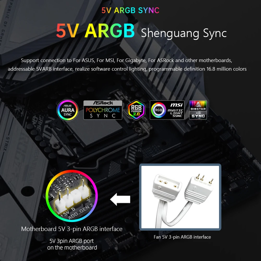 3. 5V ARGB, Aura Sync:Admite la conexión de interfaces ARGB direccionables de 5V para ASUS / MSI / Gigabyte / ASRock y otras placas base para lograr el control de la iluminación por software, y se pueden definir 16,8 millones de colores mediante programación. Admite control de temperatura inteligente PWM de la placa base, ajusta automáticamente la velocidad del ventilador de acuerdo con la temperatura de la CPU, ahorra energía y reduce el ruido, y le brinda un disfrute silencioso.