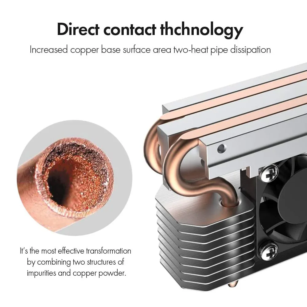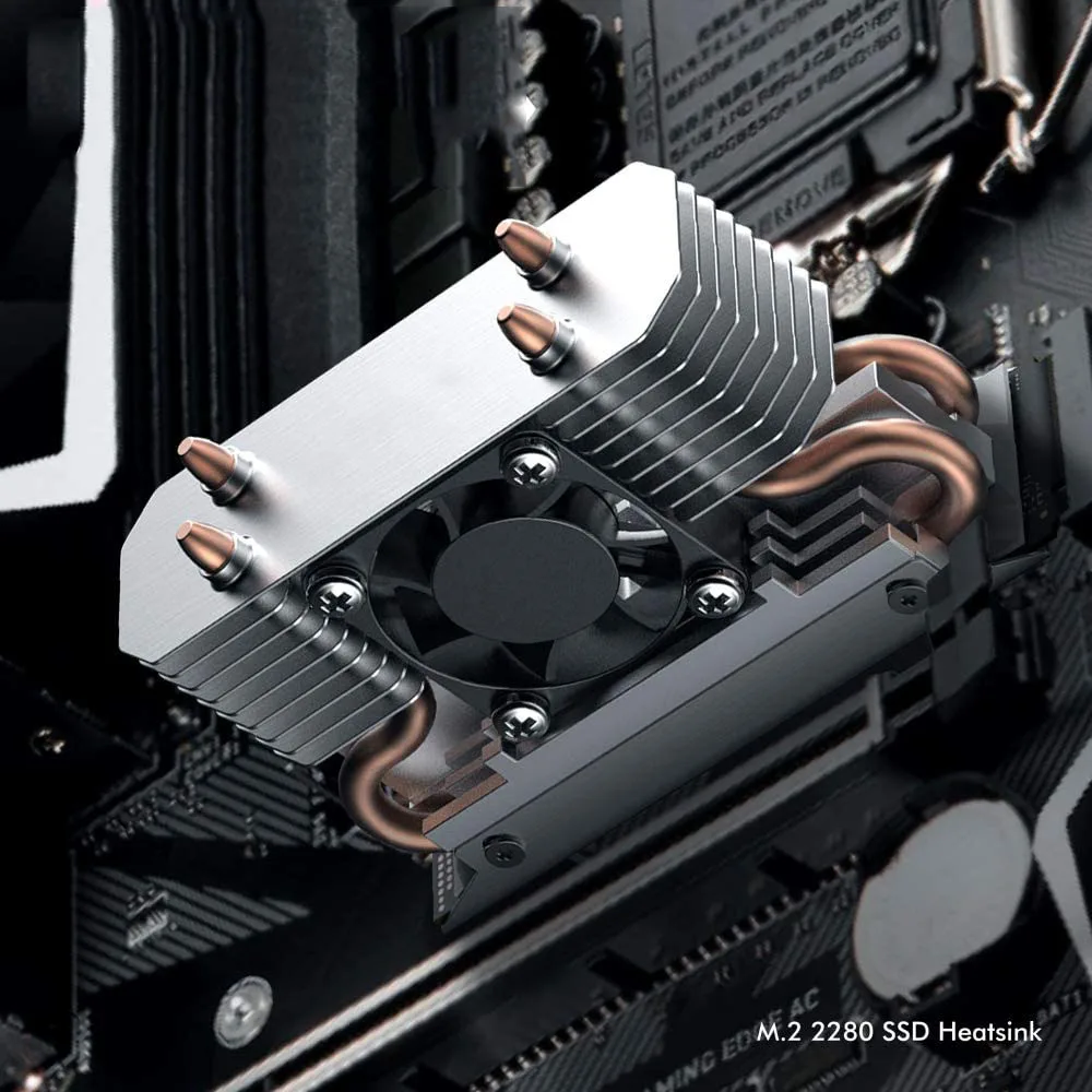 El potente enfriador M.2 NVMe 2280 SSD viene con 4 tubos de calor de cobre puro y ventilador PWM de 30mm para garantizar una excelente transferencia de calor desde M.2 NVMe 2280 SSD.