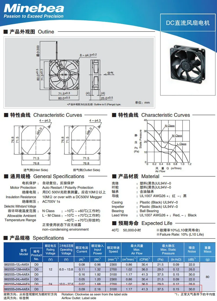 Modelo del producto: 08025SS-24N-AL Tamaño de apariencia: 80 × 80 × 25mm Distancia del orificio central: 72x72mm Referencia de velocidad: 3100 ± 10% Vida útil: 50000 horas Referencia de ruido: 30dB Voltaje nominal: 24V Corriente nominal: 0.12A Referencia de volumen de aire: 41.3cfm Función de medición de velocidad: No compatible Función PWM: no compatible Tipo de interfaz: 3 pines y muchas otras interfaces (longitud del cable 9cm). Póngase en contacto con nosotros para otras interfaces Origen del ventilador: China Tipo de embalaje: embalaje industrial de caja grande, sin embalaje único Precaución: Negativo negro, positivo rojo, función de alarma de parada blanca
