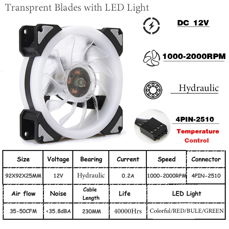 Tamaño del ventilador único: 92 mm (ancho) * 92 mm (profundidad) * 25 mm (alto) / 3,6 pulgadas (ancho) * 3,6 pulgadas (profundidad) * 1 pulgada (alto)