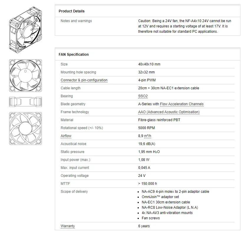 Precaución: Al ser un ventilador de 24 V, el NF-A4x10 de 24 V no puede funcionar a 12 V y requiere un voltaje de arranque de al menos 17 V.Por lo tanto, no es adecuado para aplicaciones de PC estándar.