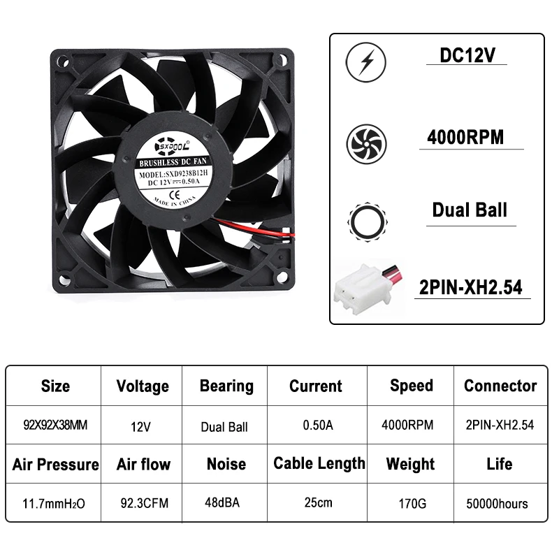 Nuevo, excelente calidad a un precio atractivo DC 12V 92mm 9cm 9238 inversor de doble rodamiento de bolas ventilador de refrigeración sin escobillas Ayuda a que sus productos eléctricos se enfríen, prolongan la vida útil del sistema y funcionan mejor Parámetros: Dimensiones: 92mm x 92mm x 38mm Tipo de rodamiento: Bola Dual Voltaje nominal: CC 12V PowerConnector: 2Pin Corriente nominal: 0,5 AMP ± 10% Velocidad nominal: 4000RPM ± 10% Flujo de aire: 92.3CFM Nivel de ruido: 48dBA ± 10% Vida del ventilador: 50000 horas Longitud del Cable: 30cm Peso: 170 g/pcs El paquete incluye: 1 piezas 9238 ventilador Aceptar personalizado, cualquier pregunta, por favor no dude en contactar con nosotros, Gracias.