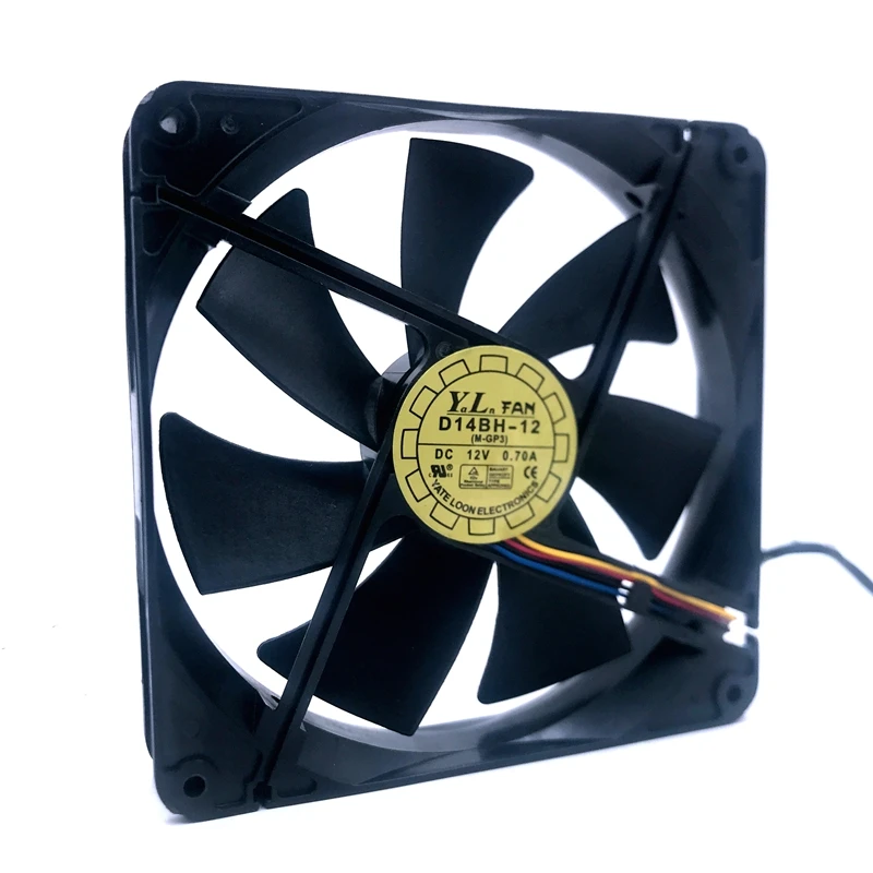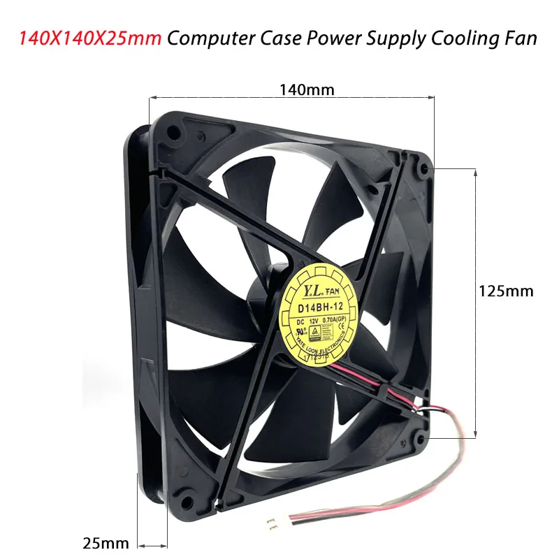 Tamaño: 140X140X25mm Voltaje: DC12V Corriente: 0,70a (0,35 a nominal) Modelo: D14BH-12 Rodamiento: rodamiento de bolas Dual Enmarcado: de plástico Interfaz: cuatro cables