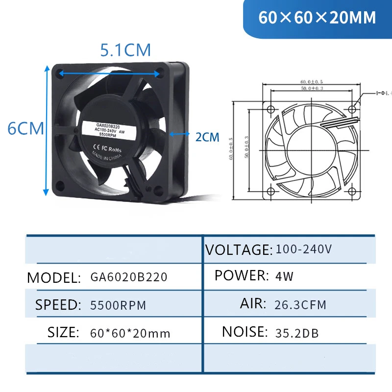 Comprar Ventilador de refrigeración de CA 100V a 240V 6020 60x60x20MM, inversor, 6CM, 2 cables