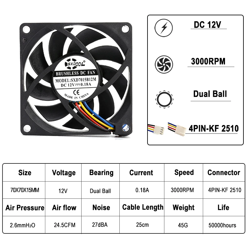 Comprar Ventilador de refrigeración para carcasa de ordenador, 2 piezas, 7cm, 70mm, cc 12V, rodamiento de bolas Dual, 3 pines, 4 pines, 3 cables, 4 cables, 7015, 70mm x 15mm