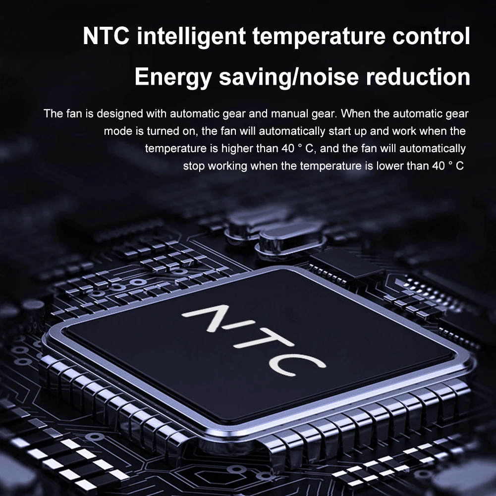 3. Control de temperatura inteligente NTC:El ventilador está diseñado con engranaje automático y engranaje manual. Cuando se activa el modo de engranaje automático, el ventilador se iniciará automáticamente y funcionará cuando la temperatura sea superior a 40 ° C, Y el ventilador dejará de funcionar automáticamente cuando la temperatura sea inferior a 40 °C.