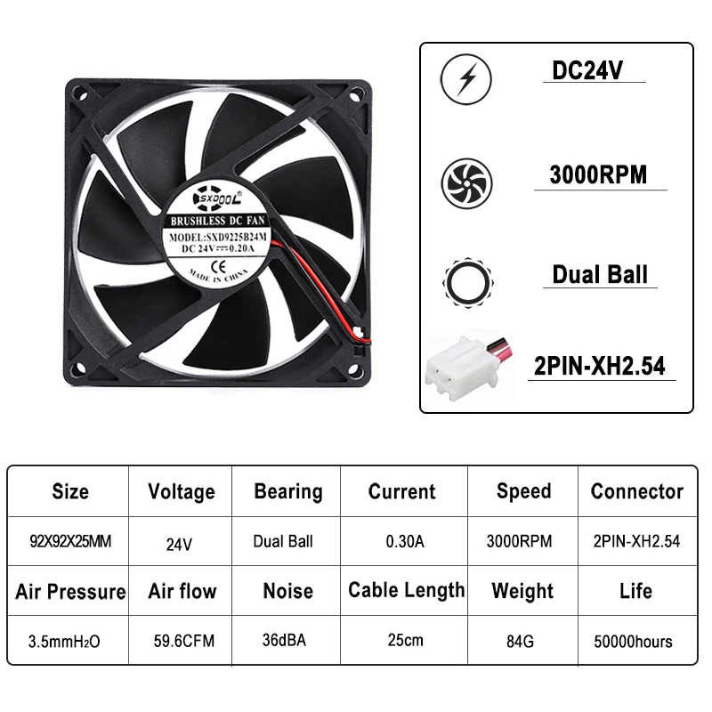 Características: completamente nuevo, excelente calidad con un precio atractivo DC 24V Ventilador 92mm 92x92x25mm Ayuda a que sus productos eléctricos se enfríen, extiendan la vida útil del sistema y funcionen mejor Parámetros: tamaño del ventilador: 92x92x25mm(LxWxH) Conector: XH2.54-2pIN Voltaje nominal del conector: 24V Corriente nominal: 0.20Amp ± 10% Tipo de rodamiento: Ruido dual: 36dBA ± 10% Velocidad del ventilador: 3000RPM ± 10% Flujo de aire: 59.6CFM ± 10% Longitud del cable: 30cm Dimensión de montaje: 82,0 ± 0,3mm Vida: 50000hrs Peso: 84 g/unids El paquete incluye: 2 ventiladores de 24V de 9225 de 30cm
