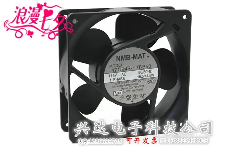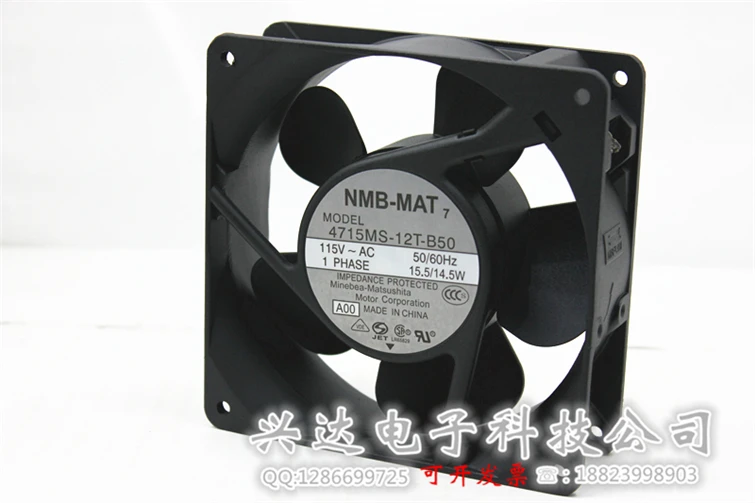 Modelo: 4715MS-12T-B50Tamaño: 120*120*38mm longitud lateral 12 cm, espesor 3,8 cmVoltaje: 115VCorriente: 0,25 APotencia: 15,5 W/14,5 W Esta calidad NMB original-el sonido es muy bueno, muy silenciosoRodamiento: doble bolaVelocidad: 2600RPMVolumen de aire: 2,5 88.25CFM m3 / minPresión del viento: 64,6 paRuido: 37DBATemperatura ambiente: -20 ~ 100 °Vida: 100.000 horasPeso neto: 550G Material: ventilador de alta temperatura de aluminio metálico Interfaz: enchufe de dos pines Características Rodamiento de bolas doble sin mantenimiento, larga vida útil, con volumen de aire de refrigeración y presión del viento adecuados