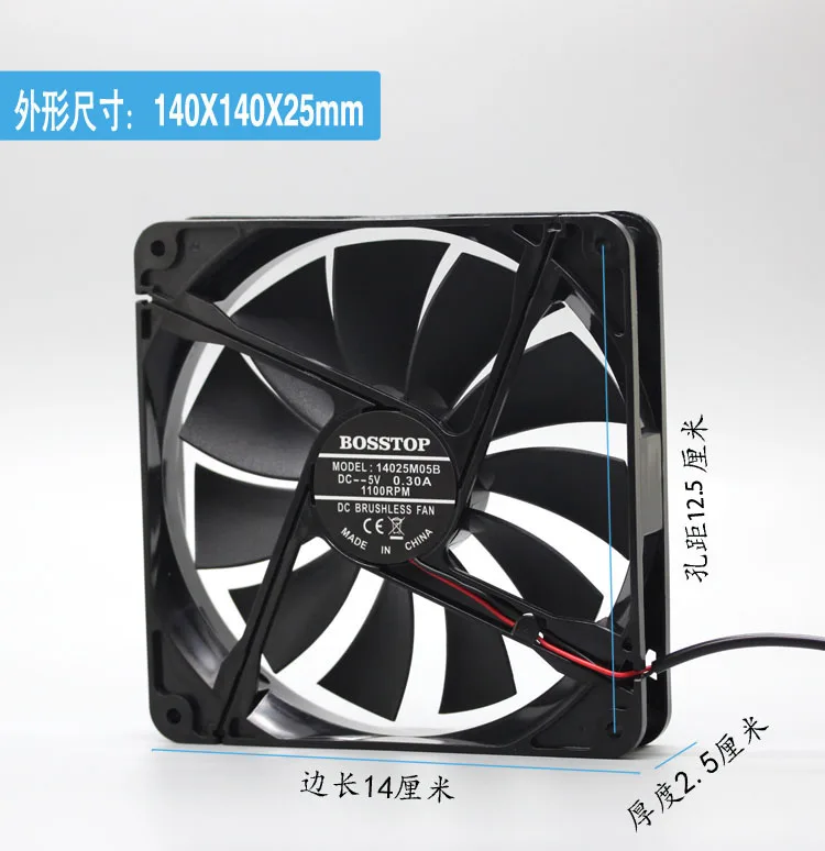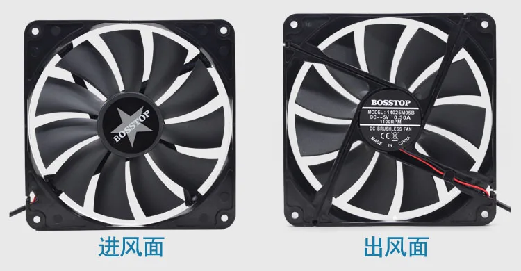 Marca del producto: BOSSTOP Tamaño: 140mm × 140mm × 25mm Referencia de velocidad: 1100 rpm Tipo de rodamiento: rodamiento hidráulico Vida útil: 30000 horas Referencia del ruido: 18 dB Voltaje nominal: 5V Tipo de interfaz: interfaz USB, contáctenos si necesita otras interfaces Longitud del cable del ventilador: 60cm Tipo de embalaje: embalaje industrial en caja grande, sin embalaje individual